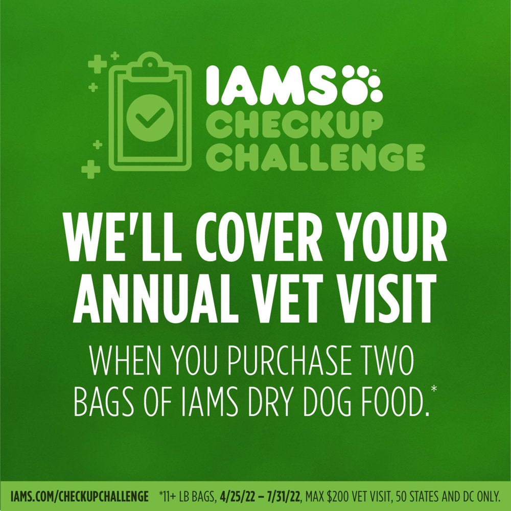 From now until July 31st, we'll cover your annual vet visit when you buy two bags. Learn more at https://www.walmart.com/m/brands/checkupchallenge IAMS PROACTIVE HEALTH Adult Large Breed Dry Dog Food is veterinarian recommended and made with real ingredients. Our recipe starts with real meat, including farm-raised chicken, and includes wholesome grains and veggies. It’s formulated with glucosamine and chondroitin sulfate for your canine's healthy joints. Plus, our quality, easily digestible ingredients provide your large dog with a strong immune system for optimal health; healthy skin, coat, and metabolism; and strong bones. Look for the IAMS difference.