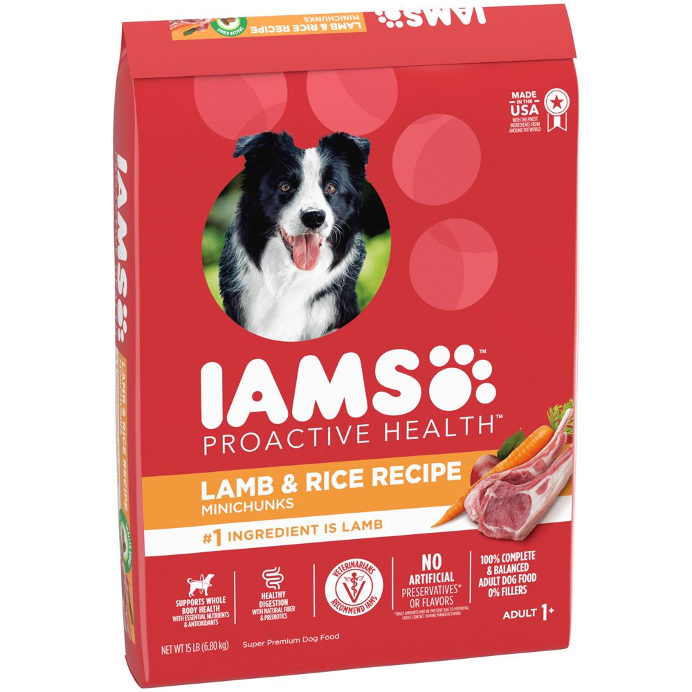 IAMS Proactive Health Minichunks Lamb and Rice Recipe Dry Dog Food, Your dog is unique, that's why IAMS makes dog food that's just as unique as they are. Lamb is the #1 ingredient in this IAMS Minichunks Dog Food, so it's full of the meaty flavor canines crave. This Lamb Rice recipe supports whole-body health with essential nutrients and antioxidants, so you know your dog is getting the most from their meals. Plus, this dry dog food promotes healthy digestion with natural fiber and prebiotics. Have a picky eater? The smaller kibble size is perfect for adult dog of all sizes. With 100% complete and balanced nutrition and wag-worthy flavor dog love, the choice is simple: Make dinnertime special with IAMS.