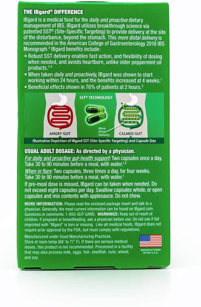 Daily Gut Health Support: IBgard is clinically shown to promote abdominal comfort, including a combination of symptoms of cramping, bowel urgency, diarrhea, constipation, bloating, and gas,Gastroenterologist Recommended: IBgard is specially formulated for the daily management of abdominal symptoms, shown to start working in as little as 24 hours,Gentle, Fast, Reliable: Patented Site-Specific Targeting (SST) technology delivers IBgard where it is needed in the gut,Ultra-Purified Peppermint Oil: IBgard is the number one Gastroenterologist recommended peppermint oil for abdominal comfort,IBgard SST (Site-Specific Targeting) delivery enables fast action and helps to minimize the potential for heartburn, unlike standard peppermint oil products