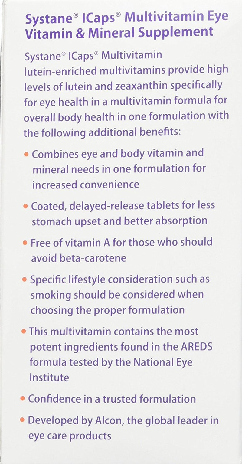 - Pack of 4 for the UPC: 300658040831 For eyes full of life. Active Ingredients: 4 Tablets: Calories 15; Total Carbohydrates 2 g; Vitamin C 512 mg; Vitamin D 400 IU; Vitamin E 430 IU; Vitamin K 25 mcg; Thiamin 1.5 mg; Riboflavin 10 mg; Niacin 10 mg; Vitamin B6 2 mg; Folic Acid 400 mcg; Vitamin B12 6 mcg; Biotin 30 mcg; Pantothenic Acid 10 mg; Calcium 300 mg; Phosphorus 140 mg; Iodine 150 mcg; Magnesium 100 mg; Zinc 84.6 mg; Selenium 40 mcg; Copper 3.6 mg; Manganese 2 mg; Chromium 120 mcg; Molybdenum 75 mcg; Potassium 80 mg; Lutein 6.67 mg; Zeaxanthin 3.33 mg; Lycopene 0.3 mg; Ascorbic Acid (Vit. C); Dicalcium Phosphate; dl-Alpha-Tocopheryl Acetate (Vit. E); Gelatin; Calcium Carbonate; Hypromellose; Microcrystalline Cellulose; Potassium Phosphate; Magnesium Oxide; Silicon Dioxide; Zinc Oxide; Starch; Sucrose; Magnesium Stearate; Chromium Yeast Complex; Polyethylene Glycol; Molybdenum Yeast; Titanium Dioxide; Selenium Amino Acid Chelate; Rosemary; Acacia; d-Calcium Pantothenate (Pantothenic Acid); Riboflavin (Vit. B2); Manganese Amino Acid Chelate; FD&C Blue #2 Lake; Sodium Ascorbate; Ascorbyl Palmitate; Cupric Oxide; Carotenoids; Pyridoxine HCl (Vit. B6); dl-a-Tocopherol; Thiamin Mononitrate (Vit. B1); Sorbic Acid; Polysorbate 80; Natural Peppermint Flavor; Sodium Benzoate; Potassium Iodide; Glycerides; Sodium Citrate; Phytonadione (Vit. K); Citric Acid; Cholecalciferol (Vit. D); Cyanocobalamin (Vit. B12); BHT; Sodium Aluminum Silicate Uses: Promotes healthy eyes and body.* ICaps MV lutein-enriched multivitamins provides high levels of lutein and zeaxanthin specifically for eye health in a multivitamin formula for overall body health in one formulation, with the following additional benefits: Combines eye and body vitamin and mineral needs in one formulation for increased convenience. Coated, delayed-release tablets for less stomach upset and better absorption. Free of vitamin A for those who should avoid beta-carotene. Specific lifestyle considerations such as smoking should be considered when choosing the proper formulation. This multivitamin contains the most potent ingredients found in the AREDS formula tested by the National Eye Institute.