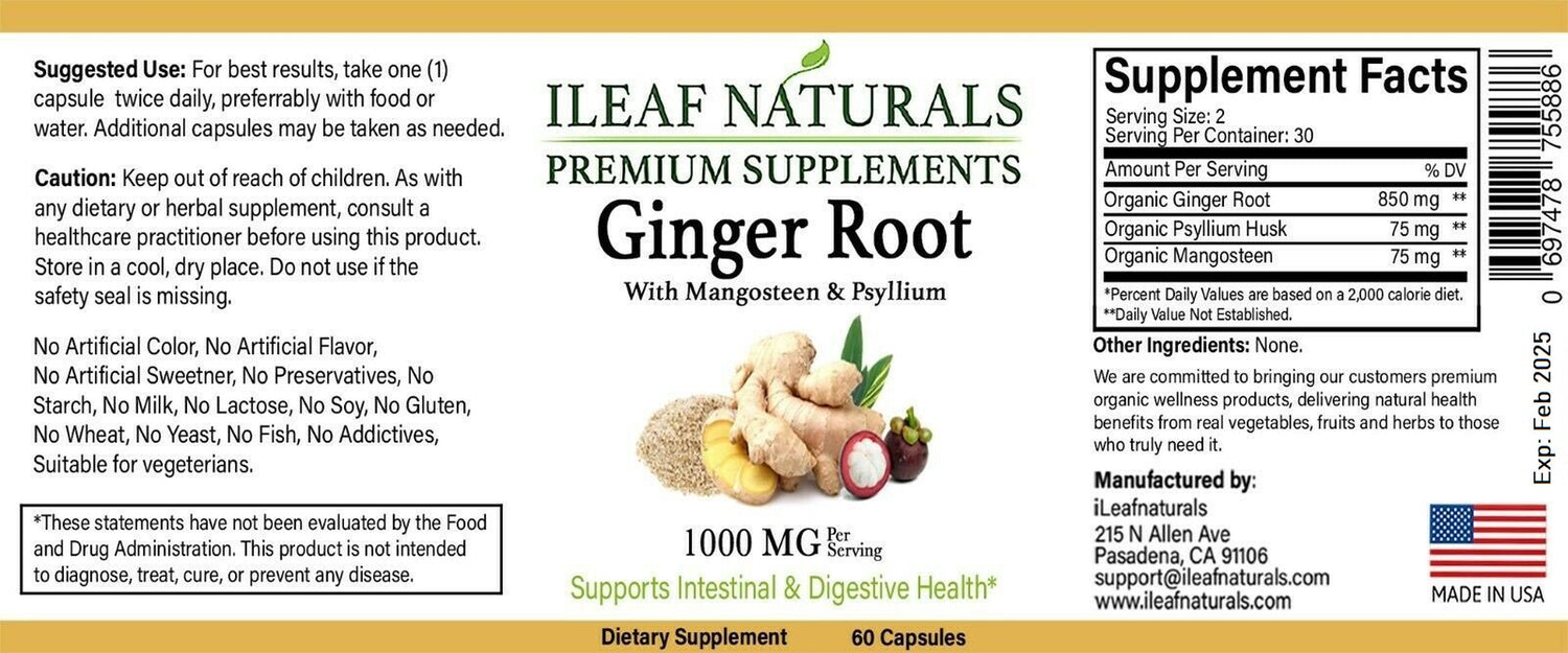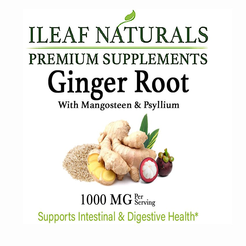 Tummy troubles? Ginger is one of the very few Superfoods worthy of that term. iLeaf Naturals Ginger herbal blend has been traditionally used to support digestive health, help relieve nausea and upset stomachs. Organic ginger root’s main bio-active compound contains powerful anti-inflammatory and antioxidant properties that has been used to help with digestive issues and fighting the flu or common cold, to name a few. It helps ease conditions known as “Cold-Wind” in the Traditional Chinese Medicine. Numerous clinical trials have shown Ginger’s ability to help relieve nausea, promote a healthy inflammatory system, strong immune system and regulate circulation. Along with organic Mangosteen, known as the “Queen of Fruits,” it contains dozens of Xanthones, known as “super-antioxidants," which makes it an effective aid to all your digestive problems. It can also help ward off constipation, may relief diarrhea and dysentery, and promote bowel regularity. The high fiber composition of the fruit also increases your Prebiotics intake, which is good for your intestines. Lastly, organic Psyllium promotes regularity, helps relief constipation and improve overall digestion. It is produced exclusively for its Mucilage content, an important main ingredient often referred to as the husk that adds to its digestive health benefits. iLEAF NATURALS Ginger Root Capsules 1000MG With Mangosteen & Psyllium Husk, Digestive Aid, Nausea & Irregularity, Immune Support, Dietary Supplement - 60 Veggie Pills.