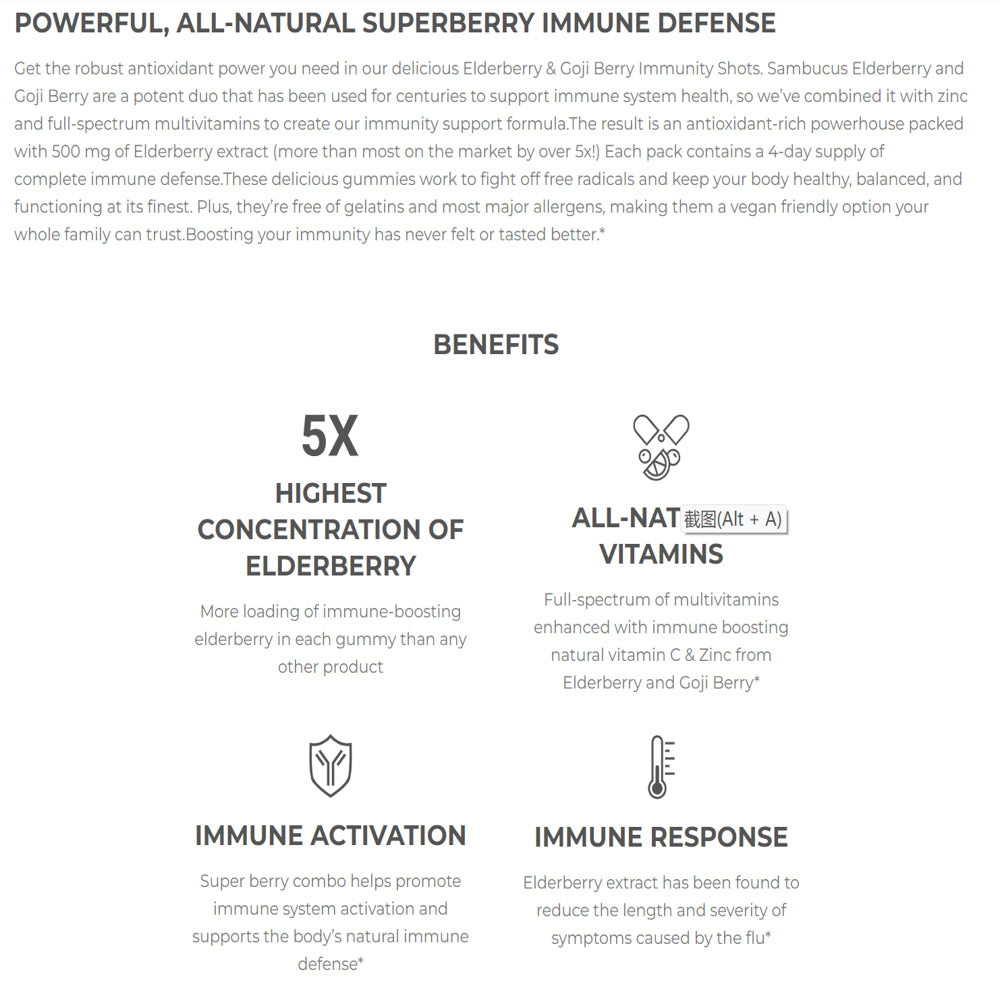 " POWERFUL, ALL-NATURAL SUPERBERRY IMMUNE DEFENSE Get the robust antioxidant power you need in our delicious Elderberry & Goji Berry Immunity Shots. Sambucus Elderberry and Goji Berry are a potent duo that has been used for centuries to support immune system health, so we’ve combined it with zinc and full-spectrum multivitamins to create our immunity support formula. The result is an antioxidant-rich powerhouse packed with 500 mg of Elderberry extract (more than most on the market by over 5x!) Each pack contains a 4-day supply of complete immune defense. These delicious gummies work to fight off free radicals and keep your body healthy, balanced, and functioning at its finest. Plus, they’re free of gelatins and most major allergens, making them a vegan friendly option your whole family can trust. Boosting your immunity has never felt or tasted better. "
