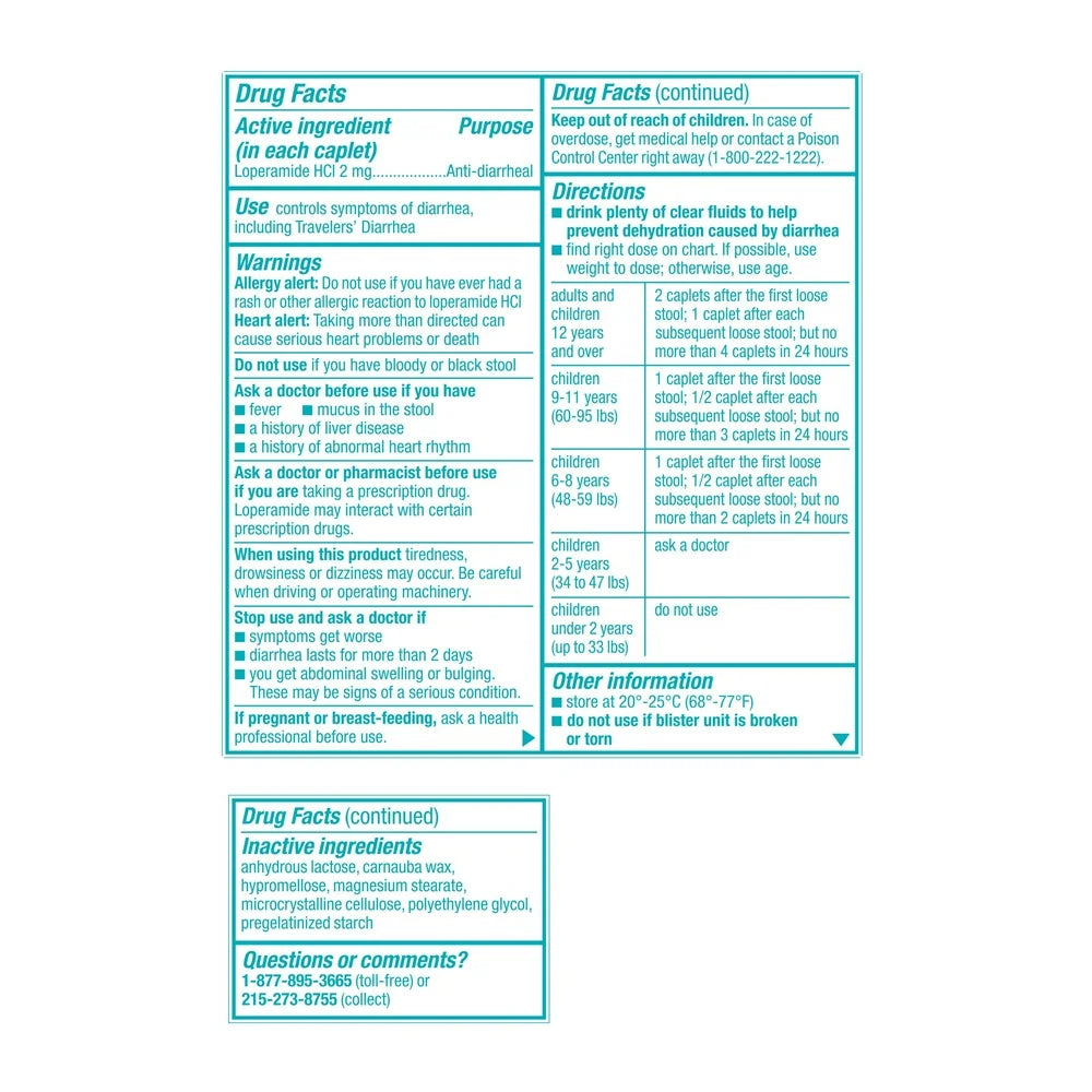 Help control your diarrhea symptoms with Imodium A-D Caplets. From the #1 doctor-recommended anti-diarrheal brand, Imodium A-D works faster than the prescription anti-diarrheal medication Lomotil, containing diphenoxylate and atropine. Each caplet of anti-diarrheal medicine contains 2 mg of loperamide hydrochloride with a proven formula that works with your body to slow down your system and restore its natural rhythm and balance. These anti-diarrheal caplets help treat and control symptoms of diarrhea due to acute, active and Traveler's diarrhea. The convenient tear-away blister packaging makes these caplets ideal for use anywhere, both at home or on-the-go. This medication for diarrhea is suitable for adults and children ages 6 and up (for children ages 2-5 ask a doctor; do not use for children under 2 years). Use only as directed.