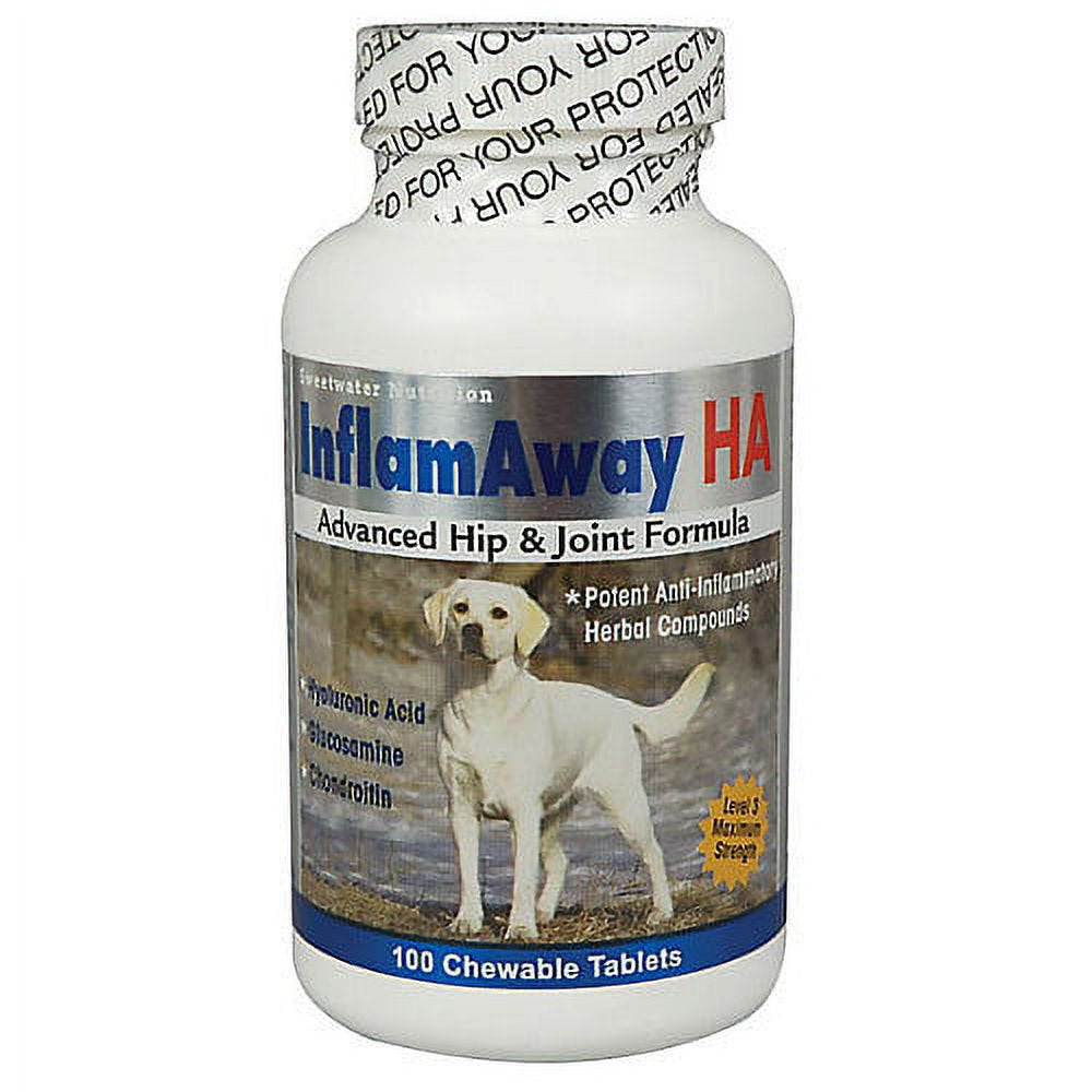 InflamAway HA is designed to protect your dog's joints with a dual line of defense. InflamAway HA delivers 20 mg of hyaluronic acid (HA) in each serving. HA is a key component of joint health and is found in the synovial fluids which naturally lubricates the joints and aids in shock absorption. Additionally, InflamAway HA combines high quality, all natural ingredients that are necessary for healthy joint function. By synergistically combining glucosamine HCl, yucca, vitamin C, MSM, and antioxidants, InflamAway HA is able to maximize the response effectiveness and absorption. Directions: 1 tab per 50 lbs of body weight. Ingredients: Hyaluronic acid...20 mg Glucosamine HCl...500 mg Chondroitin Sulfate...100 mg MSM...200 mg Yucca Powder...300 mg Calcium Ascorbate...100 mg Garlic Granular Powder...100 mg Tumeric Root Extract...25 mg Boswellia Serrata Extra...25 mg Licorice Root Extract...25 mg.