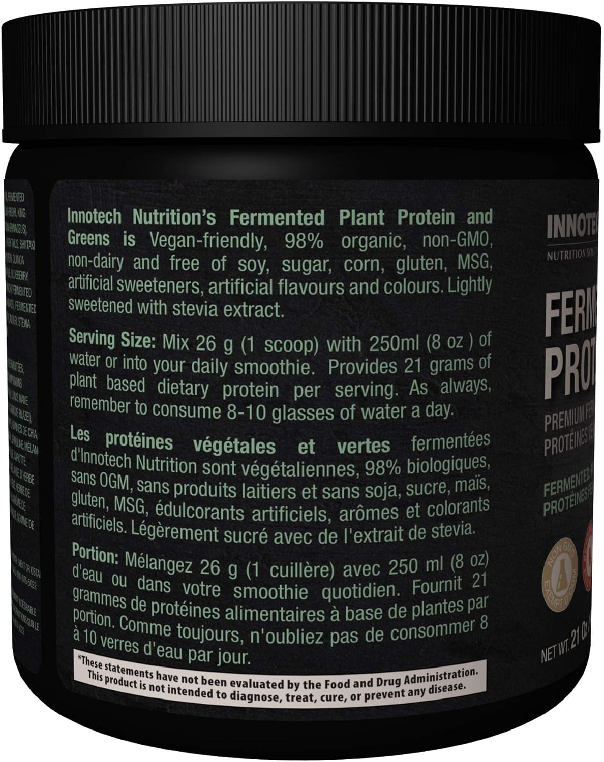 Innotech Nutrition Fermented Plant Protein & Greens is 98% Organic, Vegan-friendly, non-GMO, non-dairy and free of soy, sugar, corn, gluten, MSG, artificial sweeteners, artificial flavours and colours. Very lightly sweetened with stevia and natural flavours.