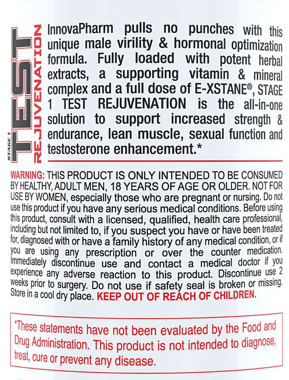 Innovpharm Stage 1 Evolution Rejuvenation ( 180ct bottle) -Enhanced w/ E-XSTANE promoting a lean, hard, dry look, while increasing free testosterone. -Optimal Male Restoration, Providing doses of Vitamin D, B6, and zinc, shown to help increase natural testosterone. -Ultra Pure Herb Complex -Loaded w/ Fadogia Agrestis which contains an abundance of natural and extremely rare alkylamide glycosides, which are believed to be potent testosterone enhancing constituents.