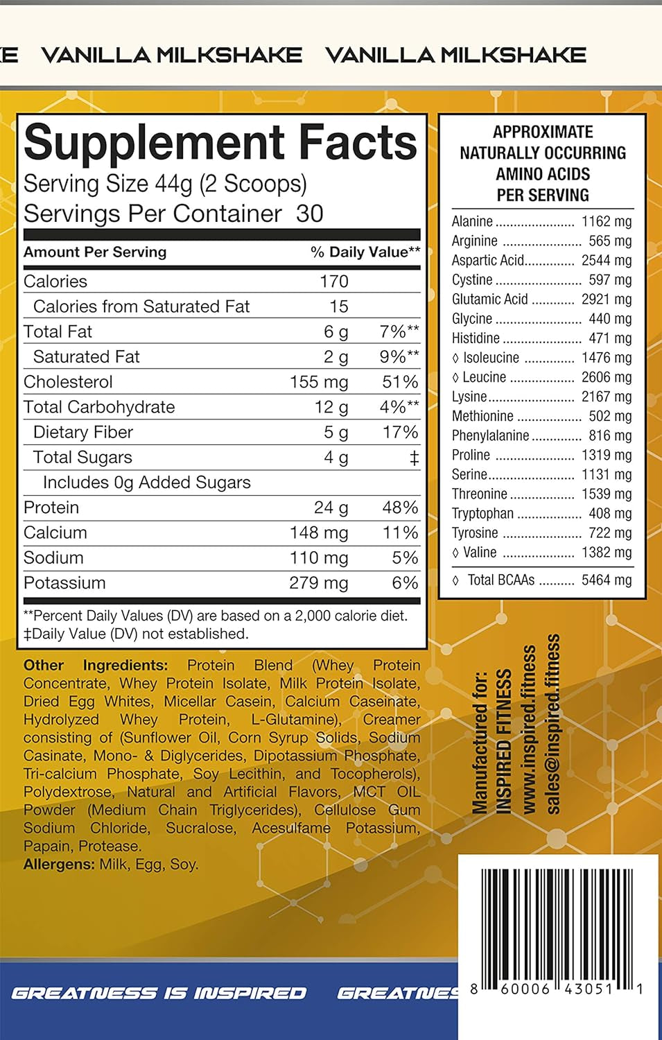 Inspired Seven Time Released Protein Blend combines seven different proteins to fuel your body for a full four hours. Proteins are digested at different rates, so by combining different proteins you enjoy an immediate, medium and extended source of nutrition as your body breaks protein down into amino acids. Inspired Seven Time Released Protein Blend is rich in BCAAs and Essential Amino Acids and has Digestive Enzymes for maximum protein absorption. MEDIUM RELEASE – Egg Protein and Milk Protein Isolate fuels your body with amino acids for 1½ hours (90 minutes). Egg is considered a perfect protein because it has the highest protein efficiency ratio. EXTENDED RELEASE – Micellar Casein and Calcium Caseinate take much longer to digest. You get a full 4 hour release of amino acids. This makes these proteins ideal for appetite control. IMMEDIATE RELEASE – Whey Protein Isolate, Whey Concentrate & Glutamine Peptides are absorbed within 30 minutes after you consume them. 7 Types of Protein 30 Servings / 2.91lb 24g Protein Blend 5g of Fiber 4 Hour Protein Release Digestive Enzymes for Absorption Mixes Easily- No Grainy taste Real Milkshake Taste A Great Meal Replacement Made in the USA