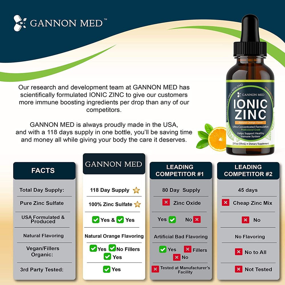 - Made In The USA *115+ Day Zinc Supply* Health Support - Cost Saver & Easy to Take. Gannon Med’s Ionic Zinc Liquid Drops are made in a GMP Certified & Inspected facility for Superior Quality and Standards, right here in the United States.