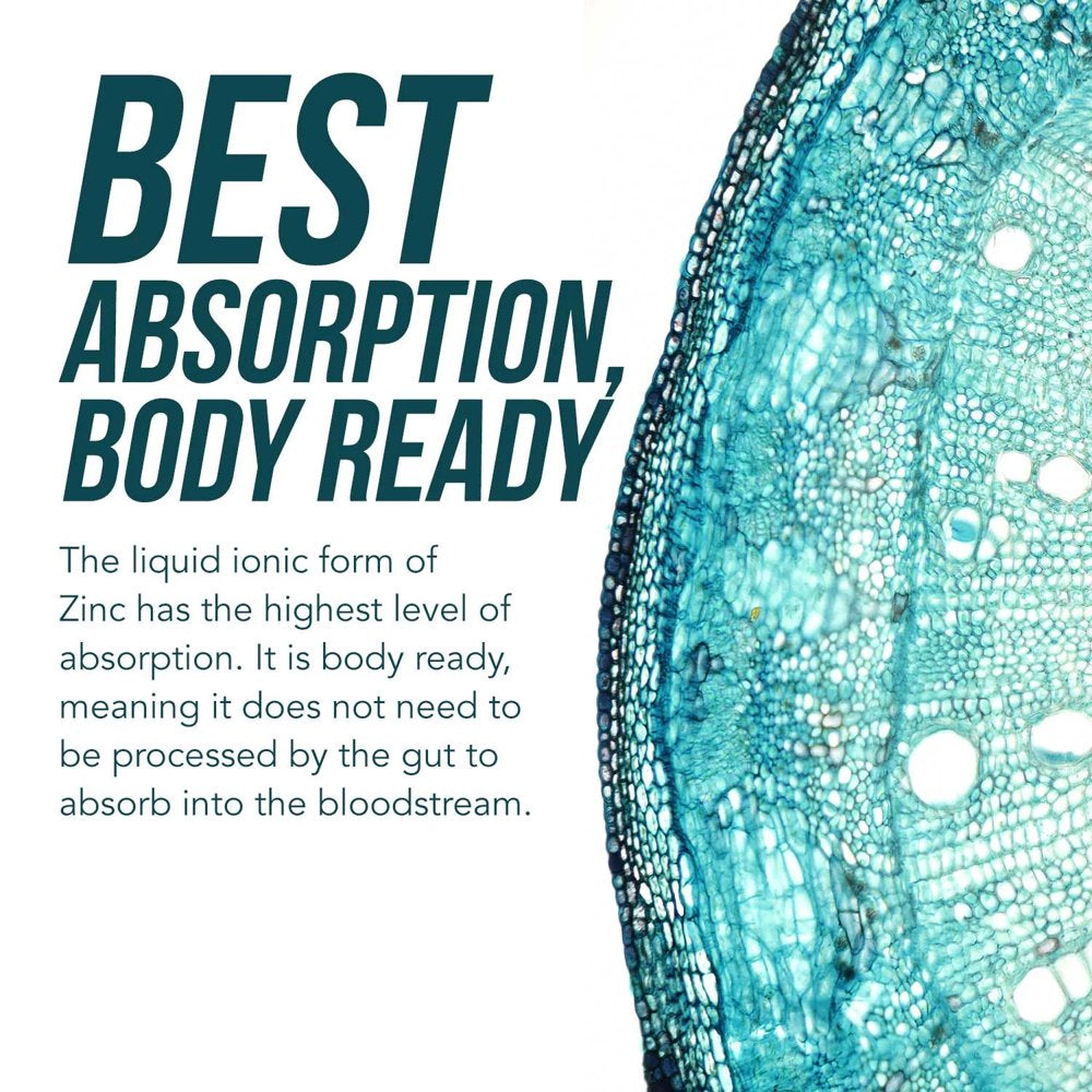 - BEST ABSORPTION, MORE EFFECTIVE THAN CAPSULES & TABLETS - Our Liquid Ionic Zinc maintains its active electrical charge and is immediately bioavailable to the bloodstream, making it the most cellularly bioavailable form of Zinc- More effective and faster acting than Zinc tablets or capsules, which require processing by the gut. Our liquid zinc supplement nourishes your body immediately upon intake.