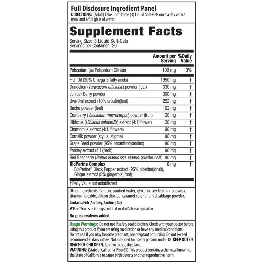 Ingredients: Potassium, Fish Oil, Dandelion powder, Juniper Berry powder, Uva-Ursi extract, Buchu powder, Cranberry powder, Hibiscus extract, Chamomile extract, Cornsilk powder, Grape Seed powder, Parsley extract, Red Raspberry powder; Gelatin, Purified Water, Glycerin, Soy Lecithin, Beeswax, Titanium Dioxide, Silicon Dioxide, Caramel Color and Red Cabbage powder.