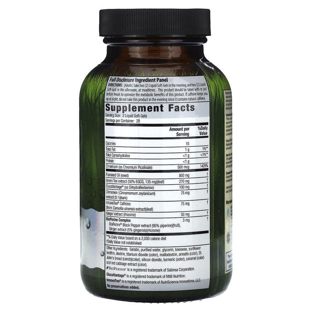 Featuring GlucoVantage® Blood Sugar Balance Dihydro Berberine: 5x Bioavailabillty Green Tea Extract: Thermo Boost Chromium Picolinate: Hunger Control Dietary Supplement Berberine has gained widespread attention for its broad ranging health benefits, and especially for its powerful ability to support blood sugar balance already within the normal range. Despite its long history of use and demonstrated efficacy, Berberine is limited by poor bioavailability... until now! Introducing GlucoVantage® DihydroBerberine (DHB) DHB is a metabolite of berberine that is simply put, the body- ready form of berberine with five-times (5X) the bioavailability of standard Berberine HCl. In other words, DHB requires a significantly lower dose to achieve the same metabolic benefits as compared to higher doses of standard Berberine HCl. Although DHB is the star of this formula, it is accompanied by the following complimentary ingredients that take this formulation to the next level: Green Tea + InnovaTea® Naturally Derived Caffeine The combination of EGCG from Green Tea Extract and naturally derived caffeine from tea leaves, while not literally "melting" fat off the body, supports increased thermogenesis and fat burning. Chromium Picolinate Chromium Picolinate supports feelings of satiety, helps reduce carbohydrate cravings, and promotes healthy insulin function. Achieving your health and weight management goals just got easier! Use daily and as directed for optimal results. What makes us different: Liquid Soft-Gels - The nutrients in these easy- to-swallow Liquid Soft-Gels are released fast. Other forms of delivery can contain binders and fillers that may cause stomach upset and offer no nutritional value. Advanced Liquid Soft-Gels provide an optimum delivery system. Quality Assurance - Irwin Naturals' is committed to providing the highest quality products for your health. We employ compliance testing to ensure purity and potency. Patented BioPerine - Our special BioPerine Complex enhances the bioavailability, absorption and potency of many nutrients.
