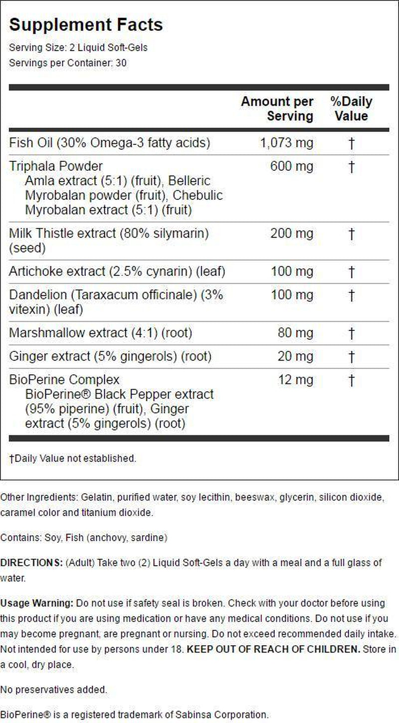Non-Laxative Formula with Triphala That Can Be Used Daily! Delicately Balanced for Optimum Intestinal Health, Liver Function & Fat Digestion Dietary Supplement Proper digestive function is the foundation from which all other elements of health derive. Daily Gentle Cleanse® combines a traditional Ayurvedic digestive blend with Western botanicals to soothe, cleanse and promote healthy digestive flow. This special non-laxative formulation enhances digestion and supports liver function. Use daily to maintain results after a cleanse or for overall digestive support. Support Movement & Function: Triphala is a blend of three Ayurvedic fruits that is traditionally used to stimulate flow and support the body's natural cleansing process. Soothe Intestinal Lining: Ginger and Marshmallow help to soothe the digestive tract. Liver and Bile Function: Milk Thistle supports liver function and helps to relieve occasional indigestion. This comprehensive formula includes healthy levels of Omega-3 Fatty Acids from Fish Oil. The ingredients in this product deliver nutritional support for your overall digestive health. What makes us different: Liquid Soft-Gels - The nutrients in these easy-to-swallow Liquid Soft-Gels are released fast. Other forms of delivery can contain binders and fillers that may cause stomach upset and offer no nutritional value. Advanced Liquid Soft-Gels provide an optimum delivery system. Quality Assurance - Irwin Naturals® is committed to providing the highest quality products for your health. We employ compliance testing to ensure purity and potency. Patented Bioperine ® - Our special BioPerine Complex enhances the bioavailability, absorption and potency of many nutrients.
