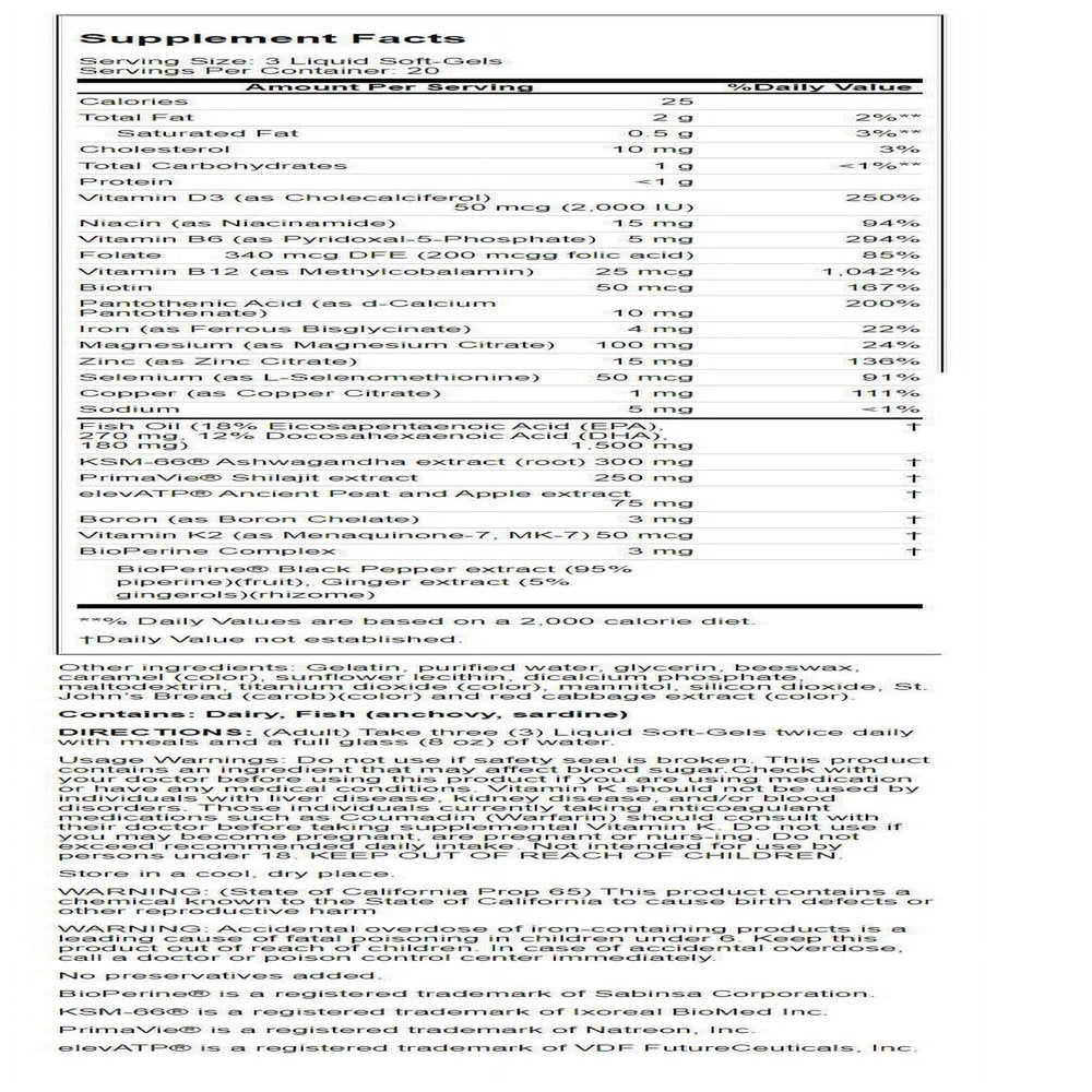 Testosterone Up, Strength & Size‡ Mega-Male Formula to Boost Performance, and Vitality in Men of All Ages Dietary Supplement BioPerine® No Preservatives Added Featuring powerful scientifically validated ingredients, this comprehensive formulation was designed to take your performance to the next level. Triple-Pronged Performance Boost Boost Testosterone Boost Strength & Size Boost Energy & Endurance ‡PrimaVie® Shilajit Extract boosts free and total testosterone while also supporting muscle recovery and growth when used in conjunction with regular resistance training. KSM-66® Ashwagandha Extract enhances cardiorespiratory endurance (VO2-max) while supporting the nervous system and adrenals to help maintain energy during times of stress and prevent the body from "burning-out." elevATP® is a proprietary combination of ancient peat and apple extract that has been shown in preliminary research to increase intramuscular ATP resulting in increased power output and training volume while reducing decreases in performance associated with overreaching. Plus, Performance & Recovery Nutrients This formula also delivers 200mg of Magnesium per daily serving, plus Vitamin D3, Vitamin K2 (as MK-7), a targeted B-Complex, Essential Fatty Acids from high-quality Fish Oil, and chelated Iron to support red blood cell production without gastric upset. What makes us different: Liquid Soft-Gels - The nutrients in these easy- to-swallow Liquid Soft-Gels are released fast. Other forms of delivery can contain binders and fillers that may cause stomach upset and offer no nutritional value. Advanced Liquid Soft-Gels provide an optimum delivery system. Quality Assurance - Irwin Naturals® is comitted to providing the highest quality products for your health. We employ compliance testing to ensure purity and potency. Global Responsibility - Over the years we have donated to organizations that support the environment and the health of our children. Patented BioPerine® - Our special BioPerine Complex enhances the bioavailability, absorption and potency of many nutrients.