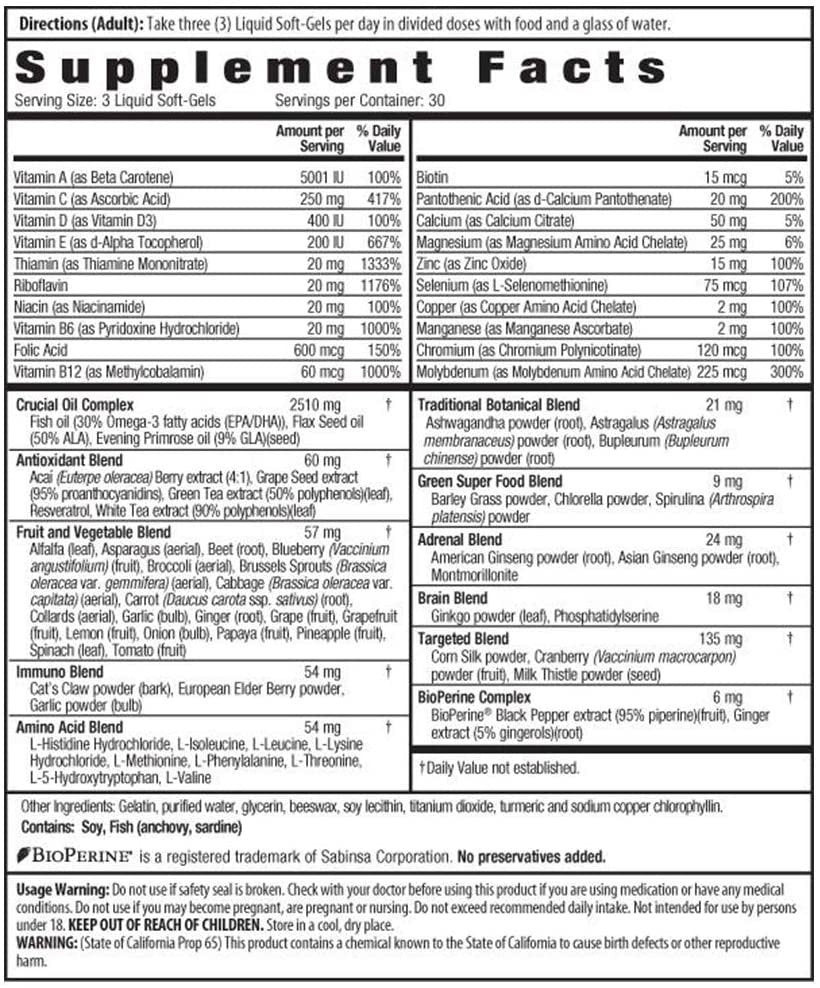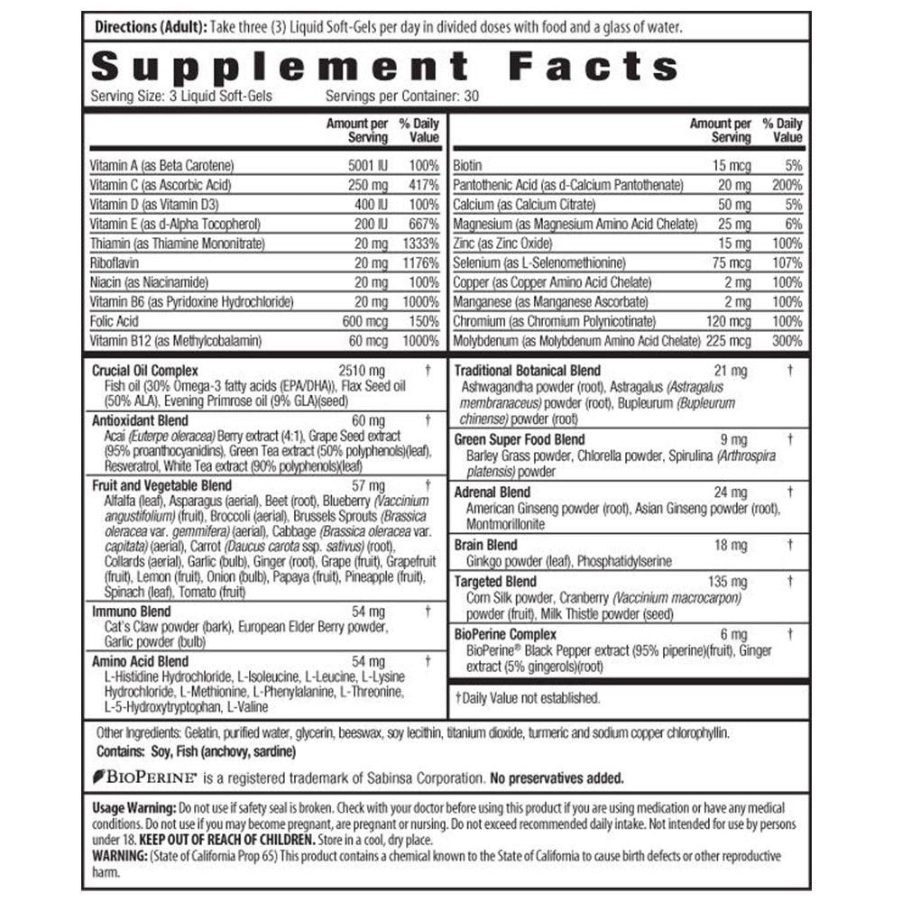But most importantly, this is one of the world’s first multi-nutrition formulas that is delivered in a Liquid Soft-Gel. So what does that mean to you? The nutrients in Soft-Gels are quickly released for use in your body, they’re easier to swallow and they do not contain binders and fillers found in tablets, so there’s more room for life-giving nutrients. But the greatest benefit of Soft-Gels is that they can hold special oils, such as Omega-3 essential fatty acids (EFAs). This breakthrough formula combines over 70 nutrients, vitamins and minerals that cover the following 12 categories: