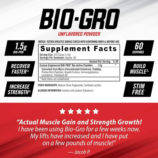 - Maximum Protein Synthesis: BIO-GRO delivers 1.5 grams of Micro-Concentrated Bio Pro Bio-Active Peptides per serving. Sugar Free, Gluten Free and Stimulant Free