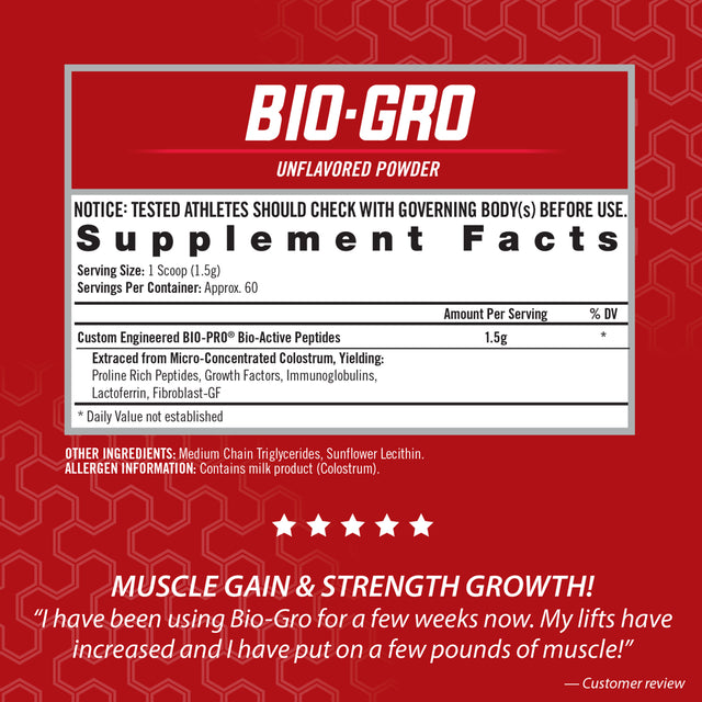 Protein Synthesis Amplifier Bio-Active Peptides - Recover Faster - Increase Strength - Build Muscle Build Muscle, Recover Faster And Increase Strength With Bio-Gro ! Bio-Gro Utilizes Bio-Pro Bio-Active Peptides (Baps) Which Are Cleaved Protein Fragments Extracted From The Highest Grade Bovine Colostrum. The First Ever To Utilize A Highly Concentrated, Patented Form Of Baps, Bio-Gro Signals The Body To Amplify The Muscle Protein Synthesis Process, And As Our Clinical Studies Have Shown, Help You To Recover Faster, Gain Strength, And Develop Lean Muscle More Efficiently After Intense Workouts.