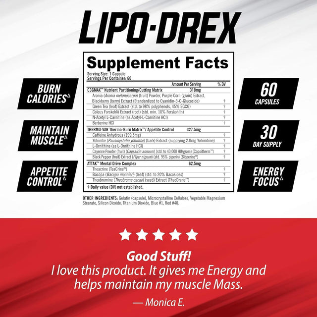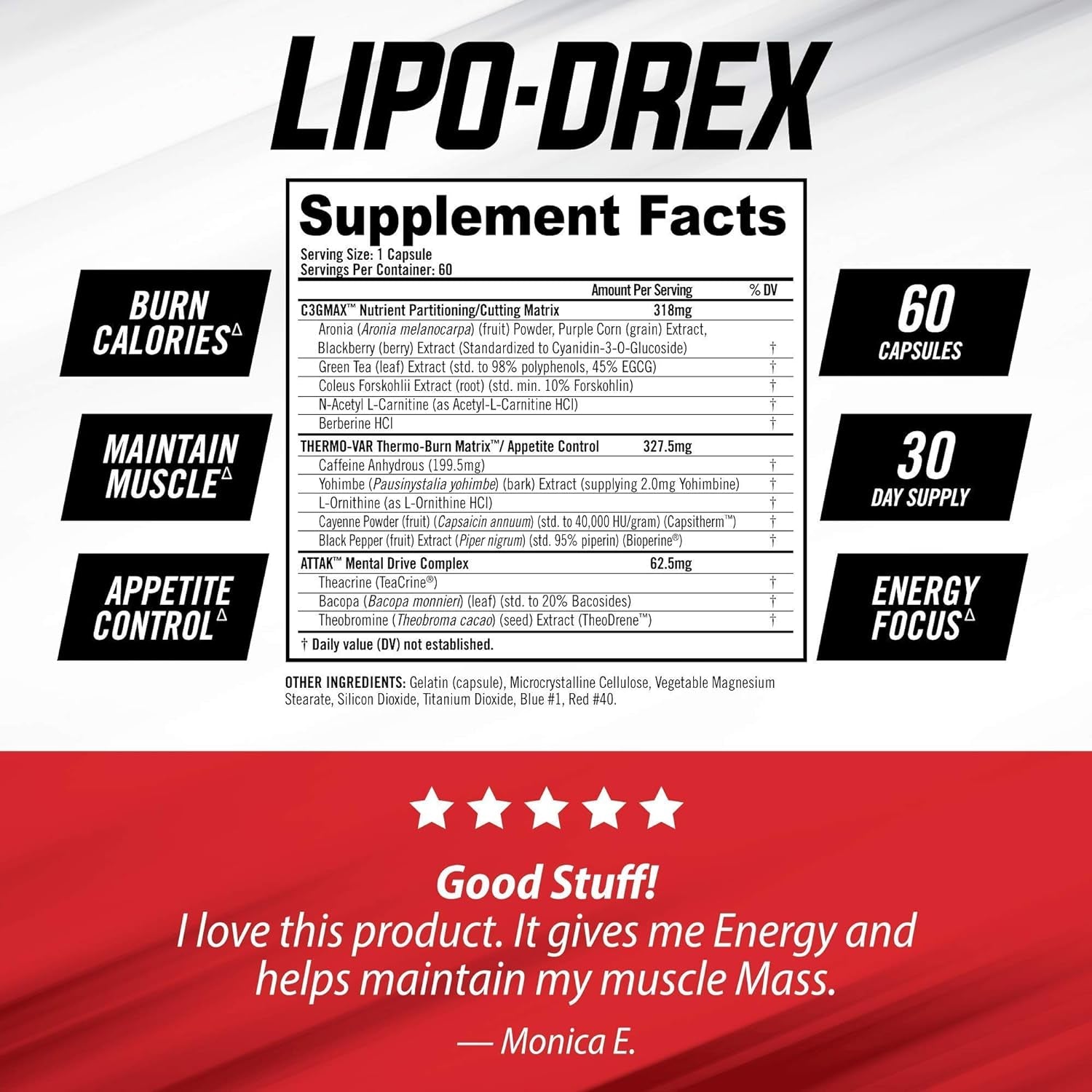- Sustained Energy: LIPO-DREX delivers sustained and smooth energy via the THERMO-VAR Thermo-Burn Matrix with ingredients like caffeine and Yohimbe. This works in combination with the ATTAK Mental Drive Complex that includes industry-leading ingredients like TeaCrine and Theobromine to give you an energetic, high-focus feeling.