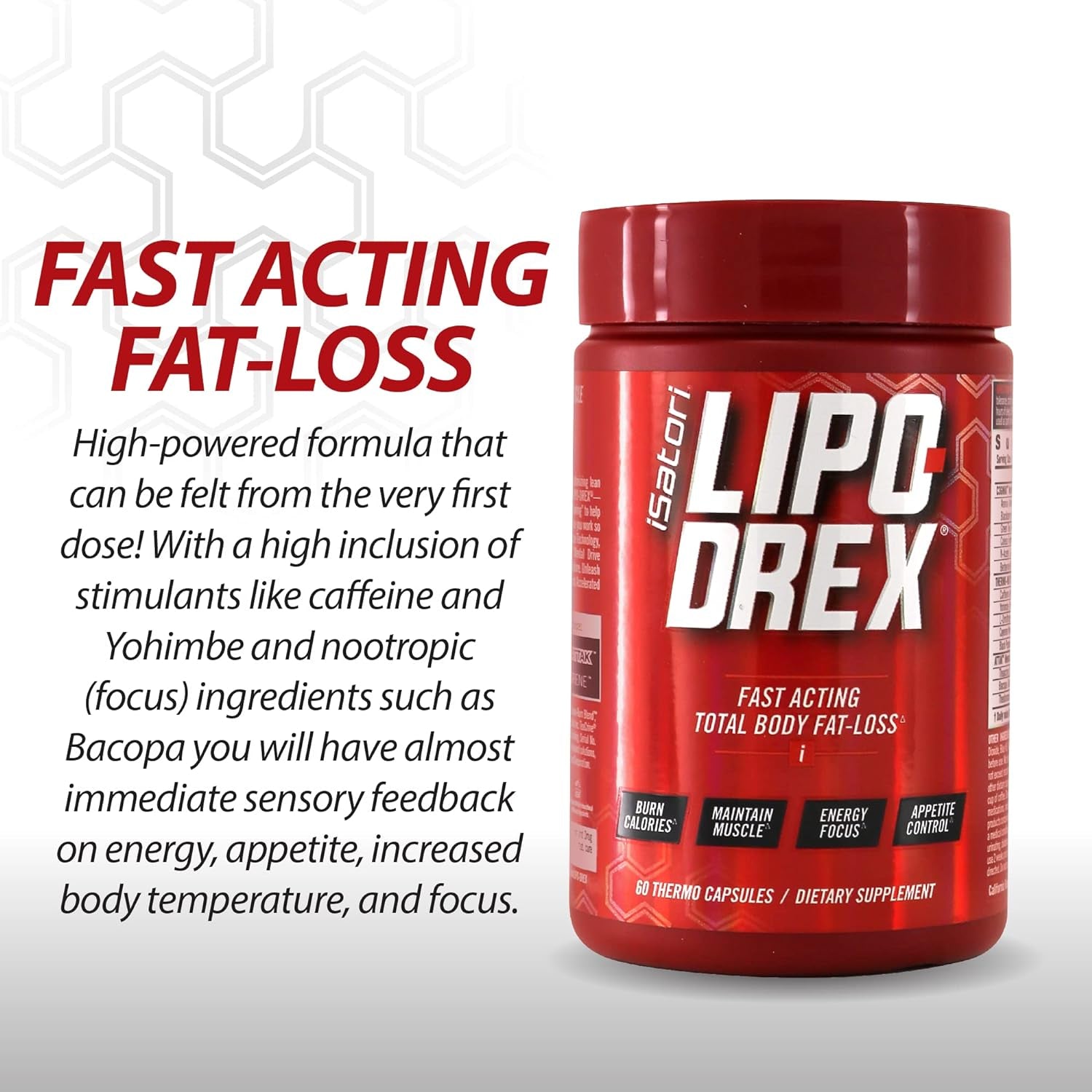 Isatori Lipo-Drex Fat Loss Thermogenic Formula - Focus Blend - Fast Acting Total Body Fat Burner Weight Loss Muscle Maintenance and Appetite Suppressant for Men and Women - 60 Capsules