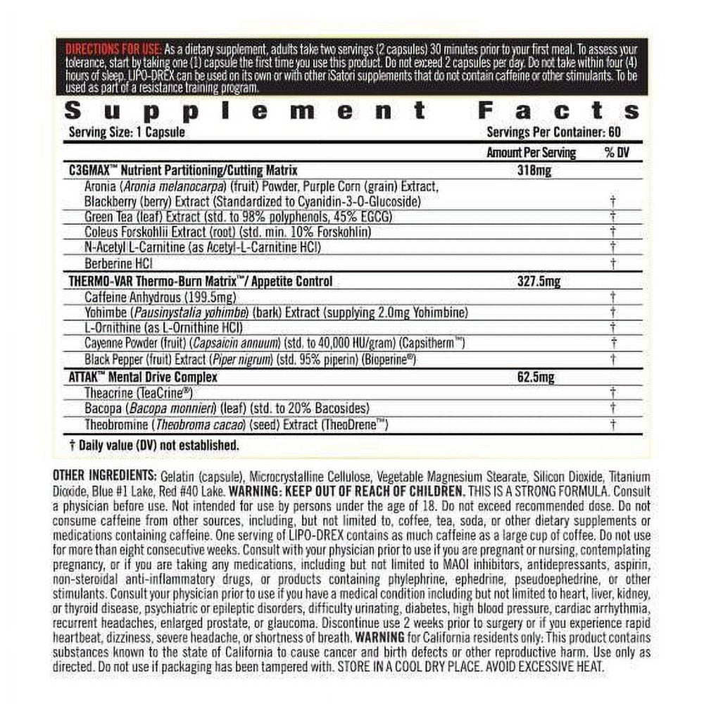 - Sustained Energy: LIPO-DREX delivers sustained and smooth energy via the THERMO-VAR Thermo-Burn Matrix with ingredients like caffeine and Yohimbe. This works in combination with the ATTAK Mental Drive Complex that includes industry-leading ingredients like TeaCrine and Theobromine to give you an energetic, high-focus feeling.