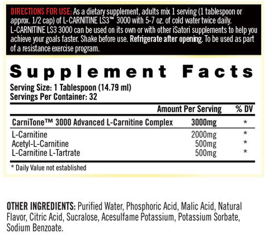 L-CARNITINE LS3 is a combination of L-Carnitine, Acetyl-L-Carnitine and L-Carnitine L-Tartrate. With this, iSatori has created a calorie free, sugar free, gluten free, great tasting liquid that supports fat loss and metabolism. 2 Bottles x 24oz = 48 oz Total