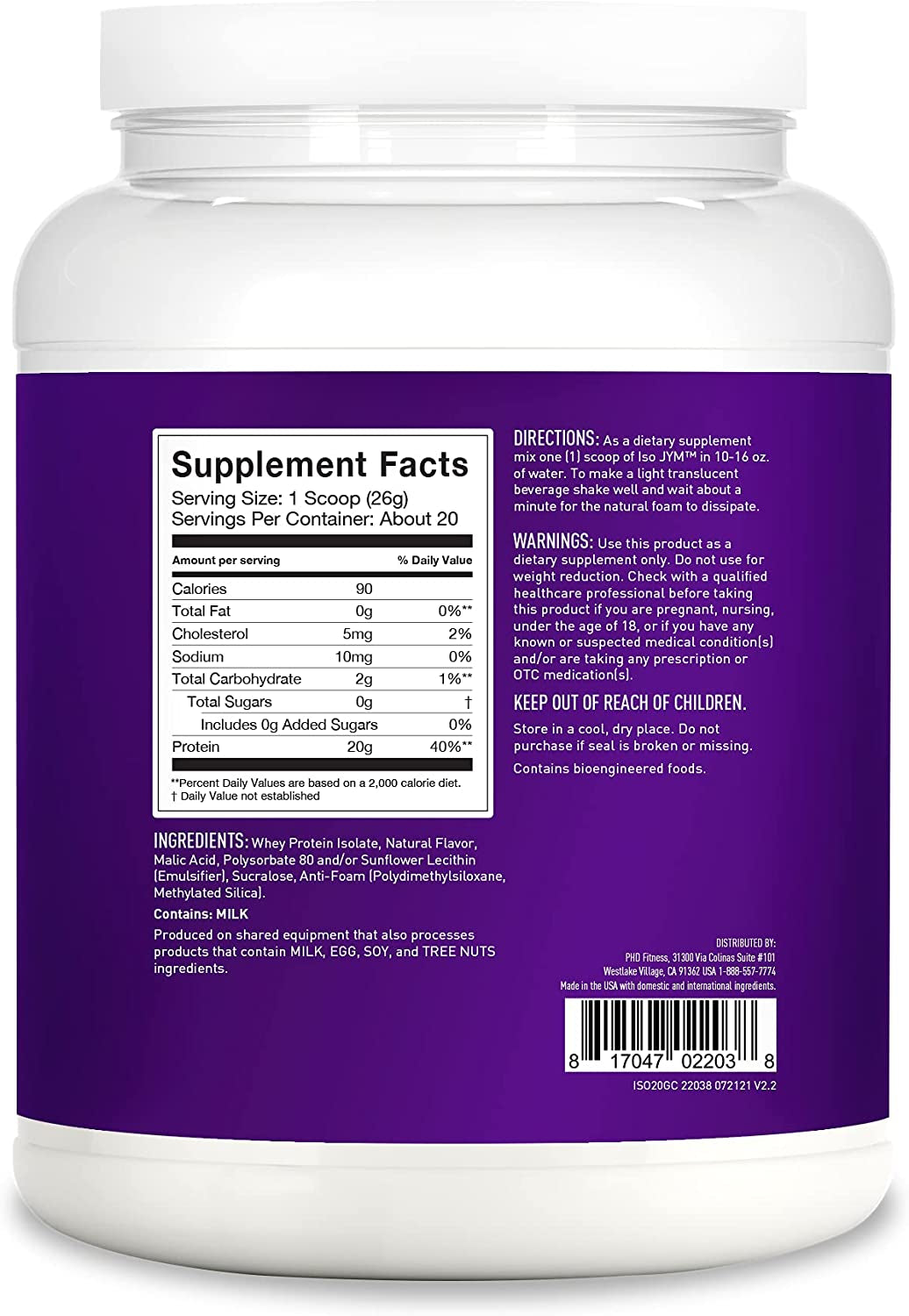 - [20G PURE WHEY ISOLATE] Iso JYM is an absolutely delicious whey protein isolate PHD designed formulation utilizing a revolutionary ultra-cold filtration process that mixes CLEAR. This amazing technological breakthrough allows for the highest quality of protein to ensure rapid bioavailability while keep the native protein ratios intact. Iso JYM is an ideal protein for individuals looking for a high-quality, whey-only product.