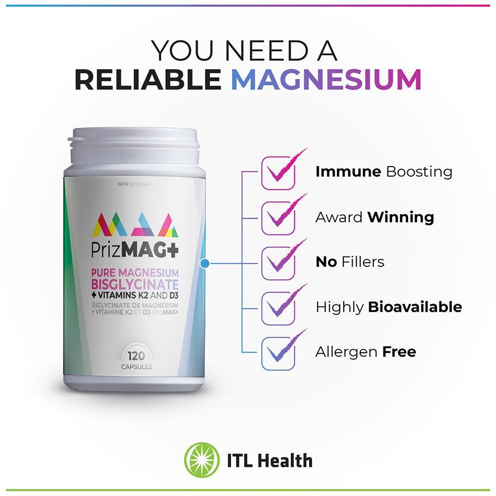 ITL Health MAG365 Prizmag plus Pure Magnesium Bisglycinate Pullulan Vegan Capsules | Including Vitamin K2 and D3 | Support Healthy, Normal Bones, Teeth and Nervous System | 90 Count is backordered and will ship as soon as it is back in stock.