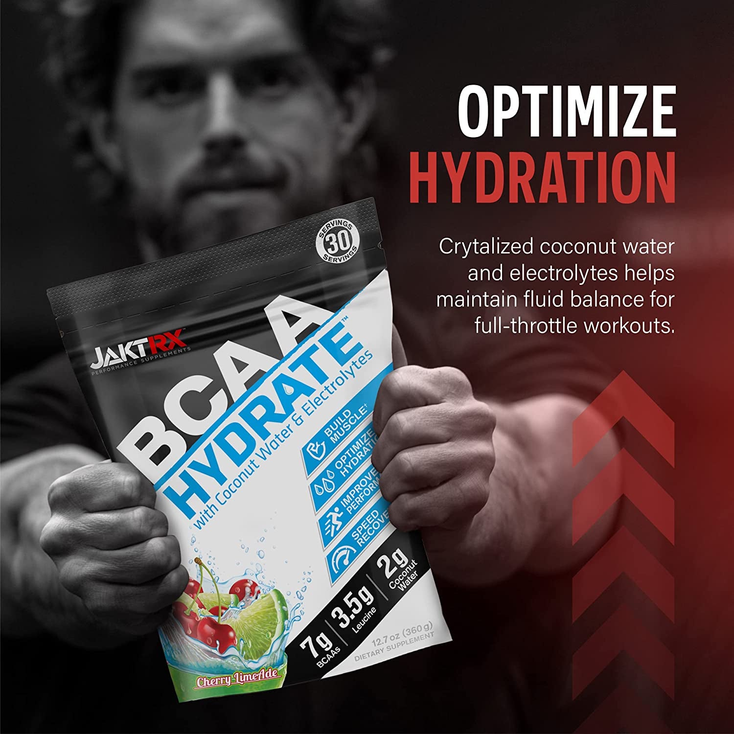 JAKTRX BCAA Hydrate - Premium Branched Chain Amino Acids & Hydration Formula - 7G Bcaas, 2:1:1 Ratio, 3.5G Leucine, 2G Coconut Water, Caffeine-Free, Electrolytes - 30 Servings (360G) - Cherry Limeade