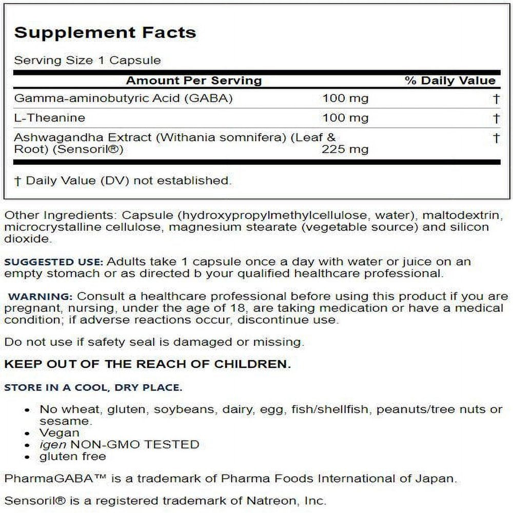 PharmaGABA? is GABA produced through natural fermentation by Lactobacillus hilgardii. Clinical studies show that PharmaGABA? can increase alpha-waves and reduce stress-related beta-waves; thus helping to promote calmness while maintaining mental focus.* Theanine; found in green tea; supports relaxation without drowsiness and may improve learning by affecting brain dopamine and serotonin.* Sensoril® ashwagandha extract is clinically studied to reduce fatigue; tension and exhaustion associated with everyday stress.*