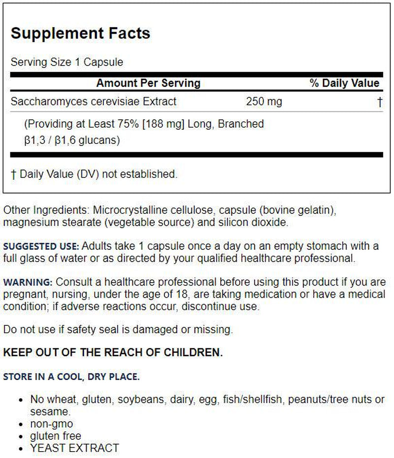 Yeast Extract Supports Immune System Non-GMO Gluten Free Dietary Supplement Immune Support Beta-Glucans are natural bioactive carbohydrates, with those derived from certain yeasts and fungi being known for their ability to support the immune system. Jarrow Formulas® Beta Glucan is a high purity extract from the cell walls of a proprietary Baker's yeast (Saccharomyces cerevisiae) strain with a unique molecular structure comprised primarily of (1,3)-ß-linked glucose chains (>75%) and a relatively small number of (1,6)-ß-linked side chains.