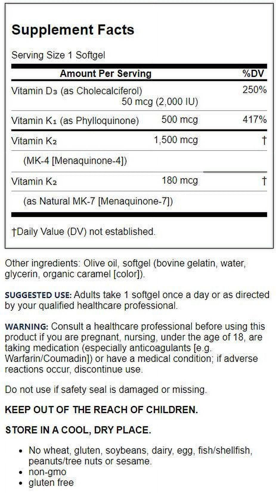 - Bone Strength Supplement: Each softgel contains 50 mcg (2,000 IU) of vitamin D3, 500 mcg of vitamin K1, 1,500 mcg of vitamin K2 (MK-4), and 180 mcg of vitamin K2 (MK-7) per serving