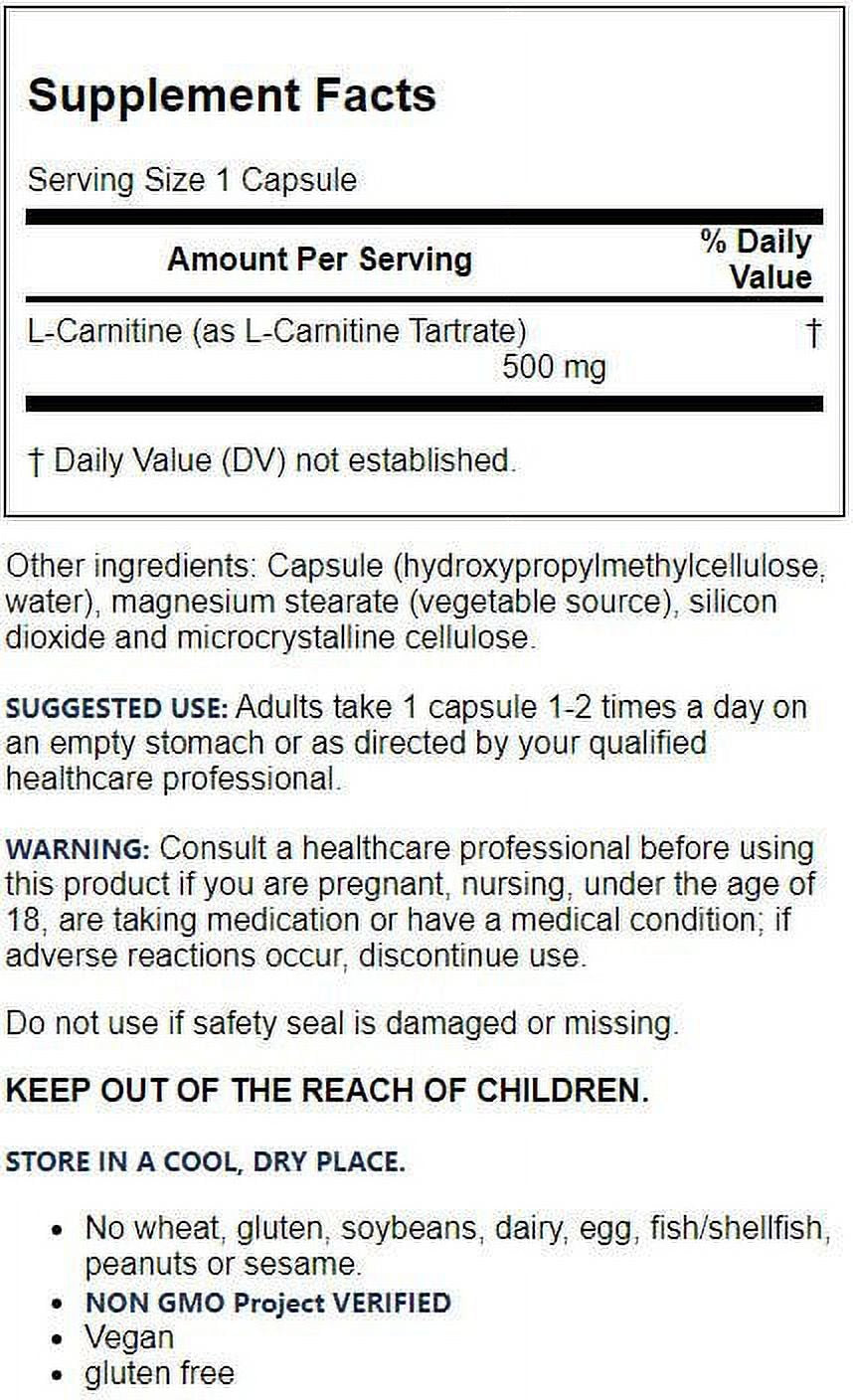 Vegan Fitness Support Important Cofactor for Energy Production from Fats Non GMO Project Verified Gluten-Free Dietary Supplement Energy Jarrow Formulas® L-Carnitine is an amino acid found in high concentrations in muscle, heart, and liver tissues. L-Carnitine transports fatty acids into the mitochondria for energy production (i.e. ATP) and reduces amino acid and protein breakdown. L-Carnitine supplementation supports an active lifestyle and your body's natural cellular energy production.