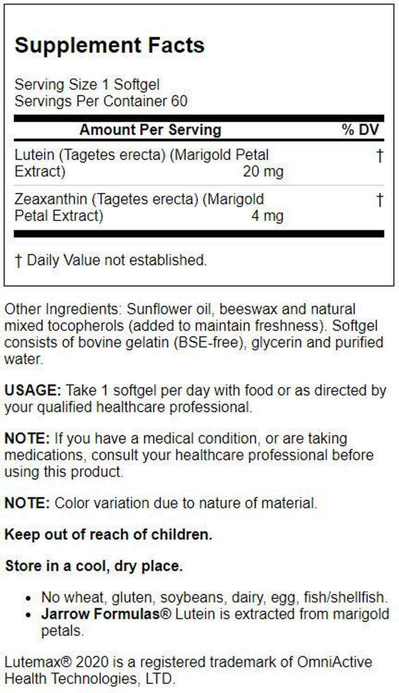 Jarrow Formulas® Lutein is extracted from marigold petals. Each softgel contains 20 mg lutein (net yield) as free lutein; the form found in the macula.*