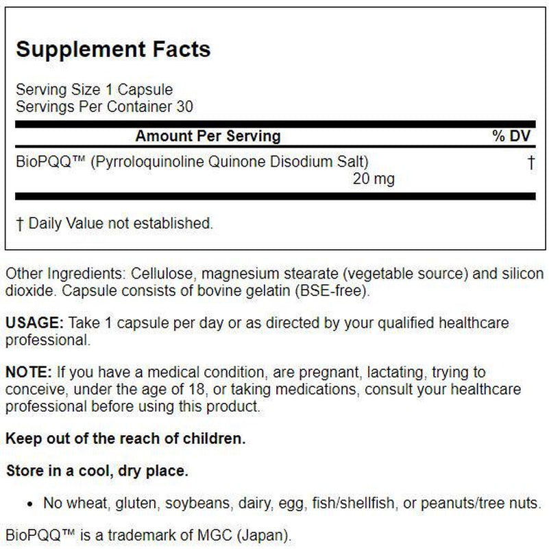 For a stronger dosage of pyrroloquinoline quinone, try this 20 milligram option. PQQ promotes the creation of mitochondria and supports heart health and cognitive function. It is an enzyme cofactor that helps to protect mitochondria from oxidative stress and promotes the creation of new mitochondria. No wheat, gluten, soybeans, dairy, egg, fish/shellfish, peanuts/tree nuts or sesame
