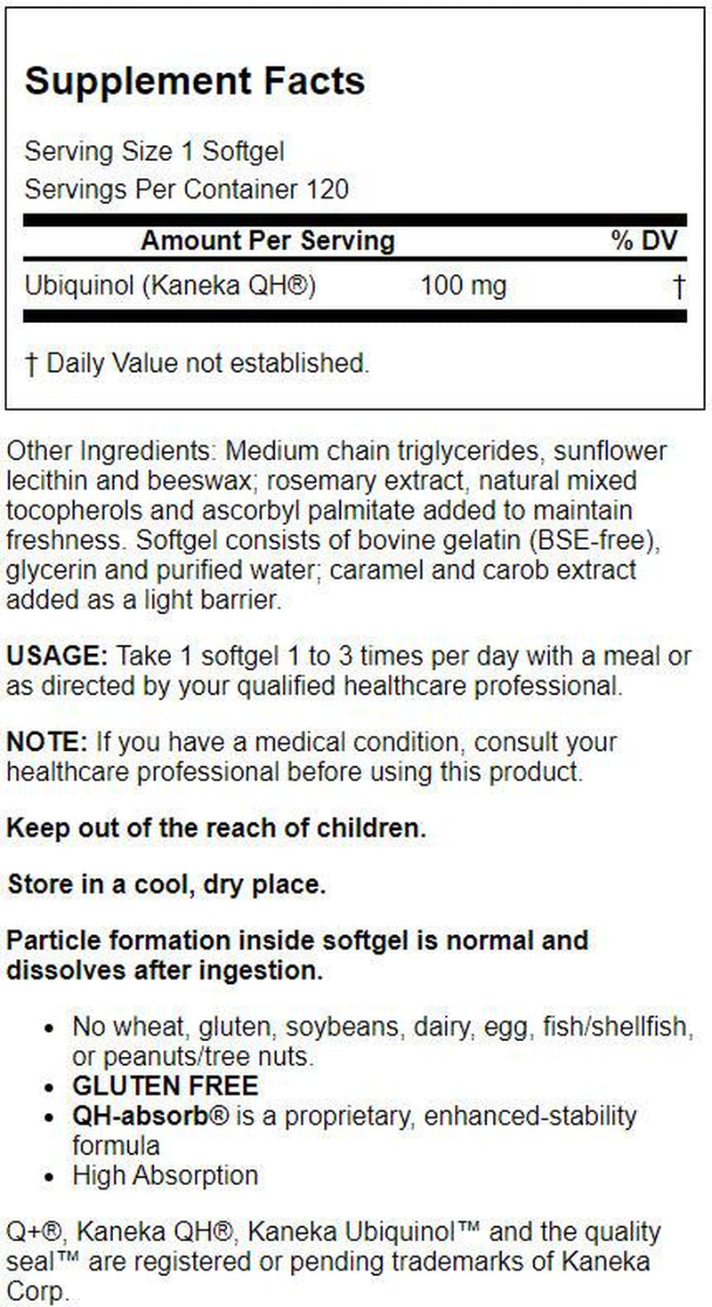 - CoQ10 Ubiquinol: Each serving of QH-absorb provides 100 mg of Kaneka QH ubiquinol, which is better absorbed than regular Co-Q10*