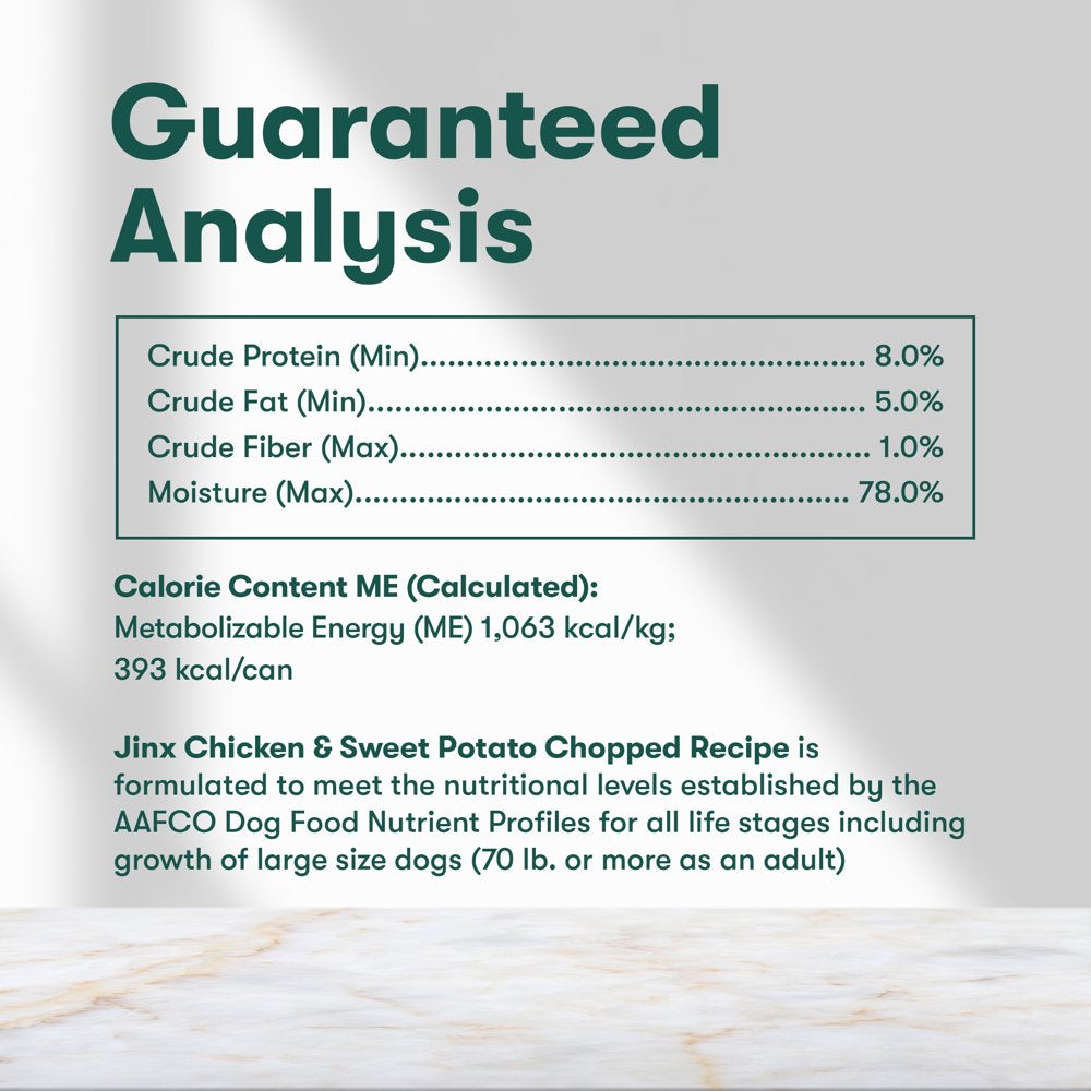 Tails will wag when you bring home Jinx Chopped Chicken Recipe Natural Wet Dog Food. Our soft and savory formula contains lean, hearty chicken, prebiotic fiber, and vitamin-rich vegetables like sweet potato and pumpkin to support your dog’s heart and health. Serve as a complete, balanced meal for dogs of all ages and breeds or use as a supplement to any diet for flavor and added nourishment. Every Jinx product comes with our promise to never use artificial ingredients or fillers like corn, wheat, soy or animal byproducts. Created for dogs of all ages, breeds and sizes.