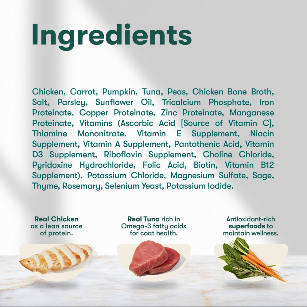 Treat your dog to the taste of a home-cooked meal with Jinx Homemades Chicken & Tuna Recipe Wet Natural Dog Food. Packed with flavor and nutrients from natural ingredients like real chicken and tuna, carrots, pumpkin, peas and real chicken bone broth, Jinx Homemades provide a whole, balanced diet for adult dogs of any breed or size. Use as a flavorful and nutrient-packed addition to any diet or serve as a complete and balanced meal for your adult dog.