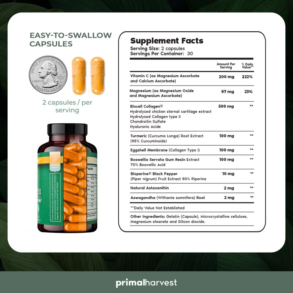 The Most Complete Joint Supplements, Natural, Fast Acting Joint Support Formula: Primal Flex utilizes some of the most powerful aspects of Ayurvedic Supplements. Ingredients include; Turmeric, Ashwagandha root, and Boswellia. 60 Joint Supplements Capsules Loaded with Vitamin C: Vitamin C does much more than help keeps your immune system strong. Primal Flex contains all the vitamin C you need daily.