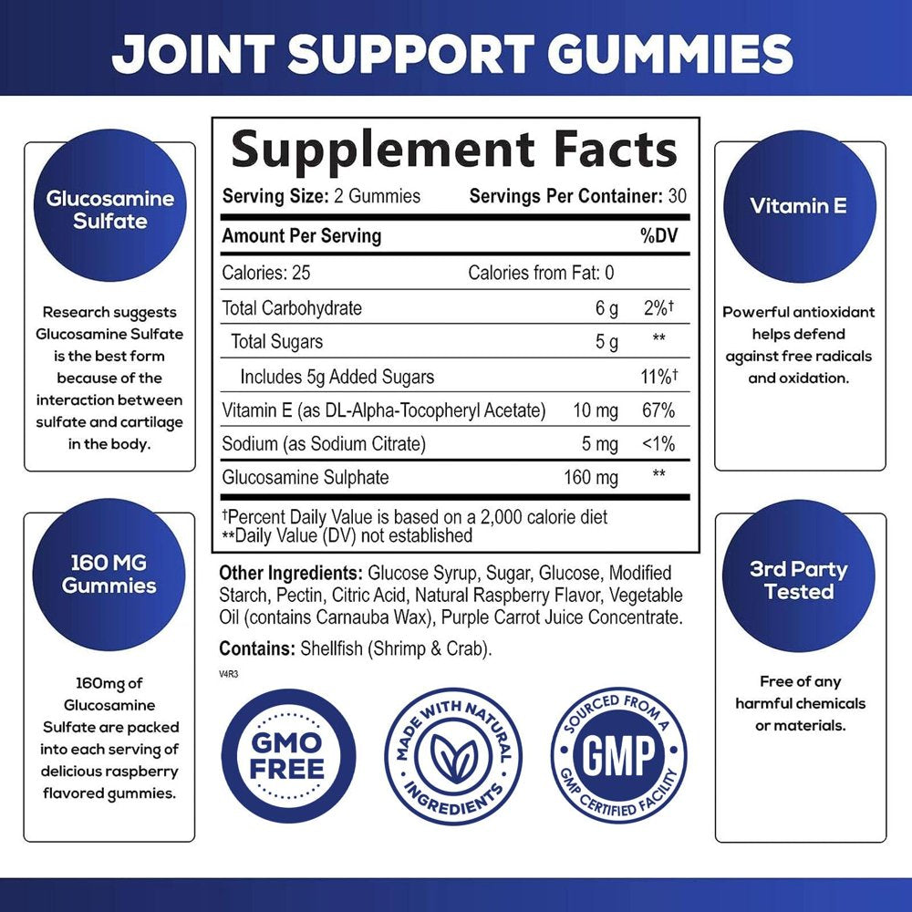 Nature's Gummies - Triple Strength Joint Support GummiesSupport for a Strong, Energetic You Gentle Joint Mobility Support Our joint support gummies are formulated to gently support joints and ease joint stiffness that happens during active daily routines. We include 160mg of Glucosamine Sulfate in every 2 gummy serving which is designed to support your joint's natural activity with old age, body composition, or athletic interests. The delicious, raspberry flavor makes them taste great too. Did You Know Glucosamine sulfate is a naturally occurring chemical found in the human body. It is in the fluid that is around joints. Due to its larger molecular size, Glucosamine Sulfate is absorbed almost 30% more and it has 12–13% better bioavailability compared to regular Glucosamine. Great Joint Support Most people aren't thinking about running, jumping and playing everyday, but they do want to be able to do simple daily activities without soreness. Nature's Choice Joint Support Gummies are designed to gently support joints. Also Includes Vitamin E Vitamin E is a powerful antioxidant that helps defend against free radicals and oxidation. Vitamin E antioxidant benefits help support joints and support mobility. Easy to Take Delicious chewable raspberry gummies are the easy swallow and are made with pectin for better texture; A natural way to support your daily routine. Trusted Formula Formulated and bottled following strict cGMP guidelines. Third party reviewed to ensure the quality and purity of each batch. Nature's Gummies - Quality You Can Trust