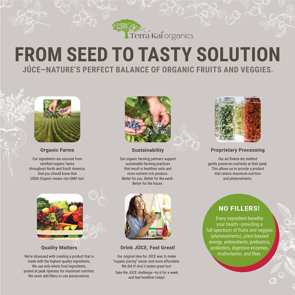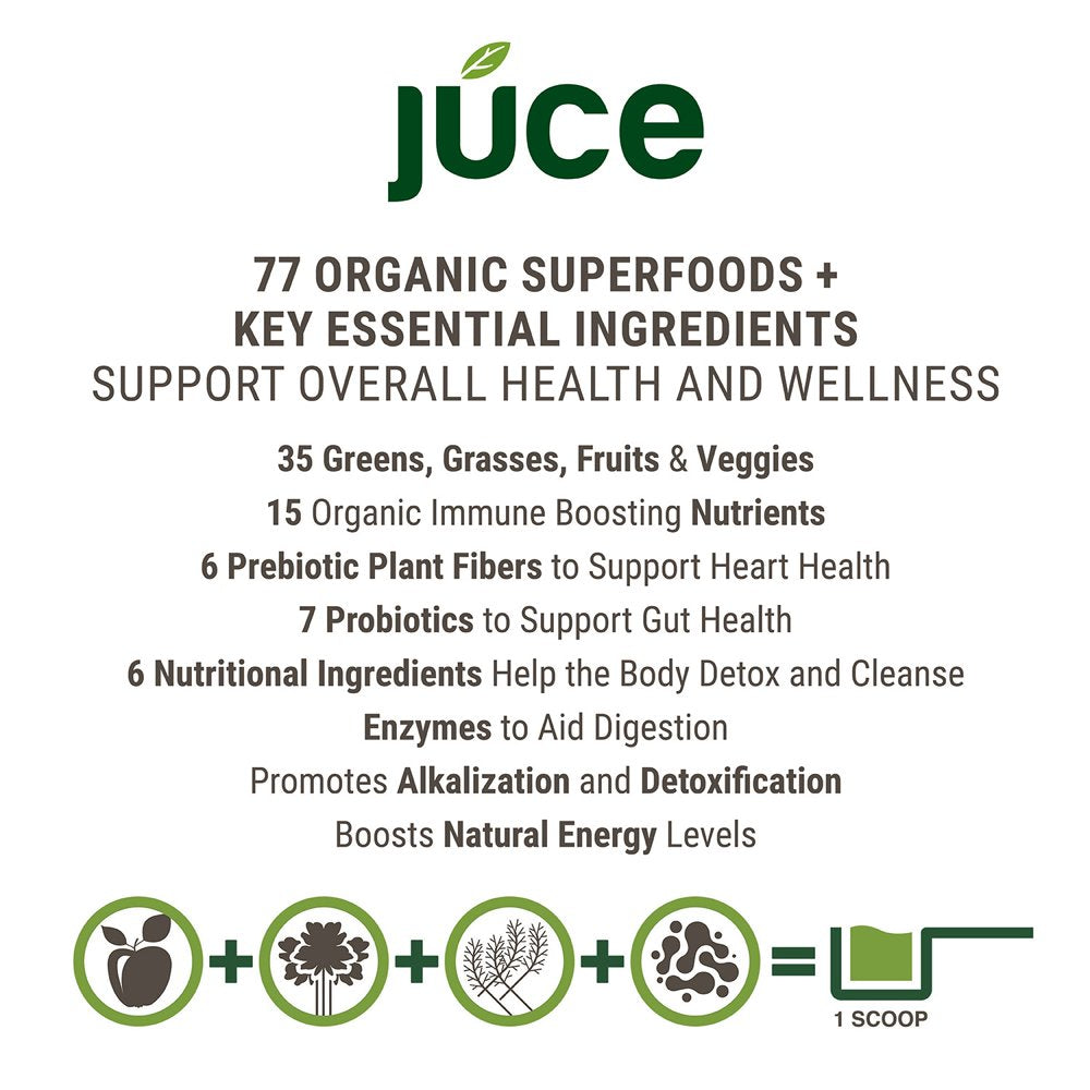 Júce Greens nourishes and renews the body with alkalizing greens, grasses, super fruits and vegetables. Amino acids, digestive enzymes and probiotics help detoxify and cleanse, revitalizing energy levels, while adapt genic herbs reduce the effects of stress and fatigue. Made from high-quality, USDA certified organic ingredients, Júce is 100% plant-based, vegan, non-GMO, and free of gluten, dairy, and soy.