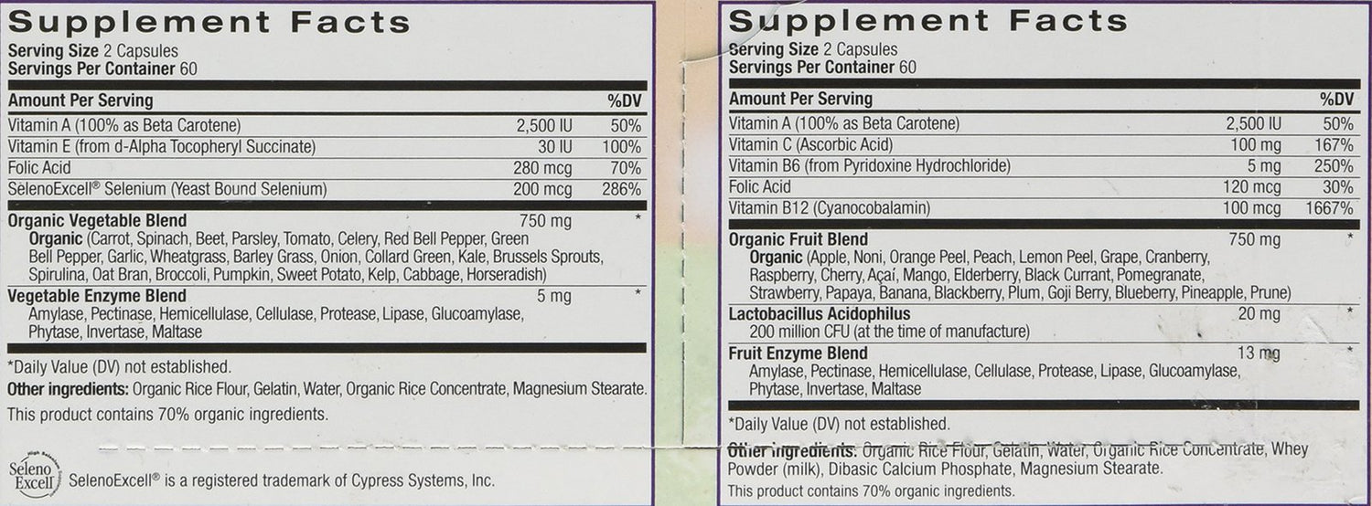 Description With 46 Fruits Vegetables Spirulina Wheatgrass Barley Grass plus Antioxidants Probiotics & Digestive Enzymes Features Super Fruits: Pomegranate Mangosteen Noni and Açai & Super Veggies: Broccoli Brussels Sprouts & Cabbage Includes SelenoExcell® a clinically tested form of Selenium Made with Organic Fruit and Vegetable Blends and Rice Flour Specifications The Ultimate Fruit and Veggie Super Food™ With a nutritional profile equivalent to the followingservings of fruits and vegetables*: Beta Carotene = ½ Cup Carrots + 1 Mango Vitamin C = 2 Apples + ½ Cup Oranges +1 Cup Strawberries Vitamin B6 = 9½ Cups Broccoli +8 Bell Peppers + 8 Tomatoes Vitamin E = 8 Cups Spinach + 2½ Cups SweetPotatoes + 5 Cups Mangos + 5 Cups Papayas Folic Acid = 4 Cups Brussels Sprouts + 4 CupsSpinach + 6 Cups Oat Bran + 4 Oranges Calcium = 1½ Cups Broccoli Selenium = 4½ Cups Oat Bran * USDA National Nutrient Database for Standard Reference Release20. Equivalence based on standard medium uncooked servings. NO Artificial Colors or Flavors Added Sugar or Preservatives Because the ingredients are natural a slight color variation of the capsulecontents may occur. Consult your healthcare professional prior to use if you have or suspect a medical condition are taking prescription drugs or are pregnant or lactating.People with allergies to corn milk or wheat should consult their healthcare professional before taking this product. STORE IN A COOL DRY PLACE KEEP OUT OF REACH OF CHILDREN.