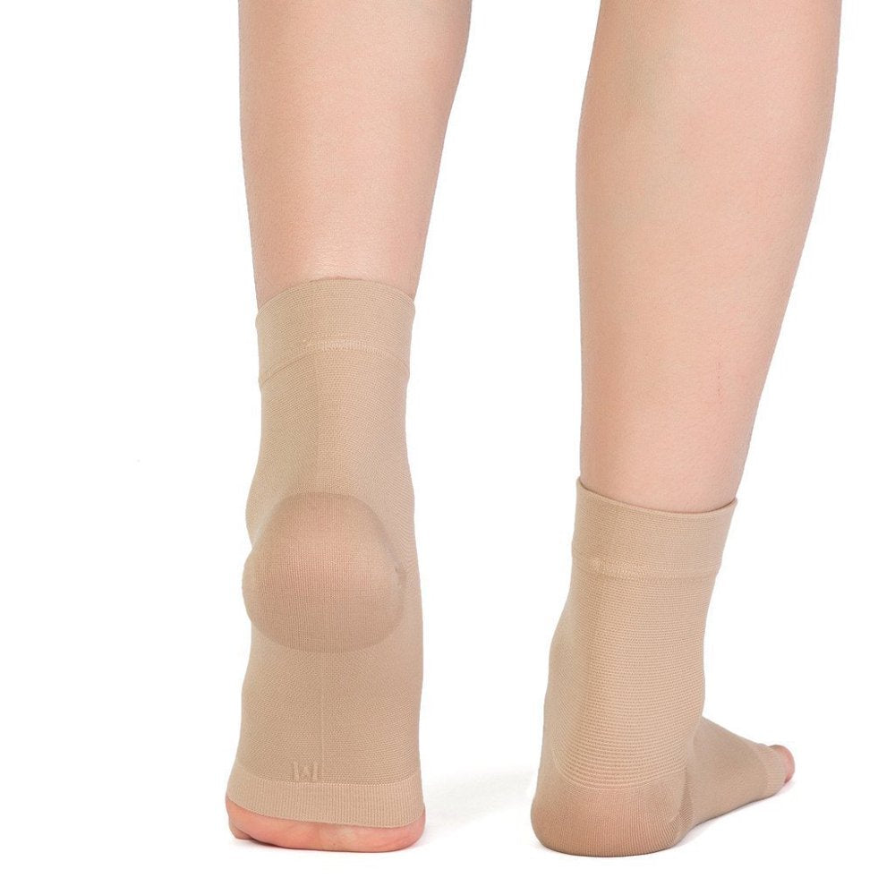 Wear these ankle compression sleeves under your shoes and socks for pain relief in your heels caused by plantar fasciitis, injury, sprained ankle, Achilles tendonitis, edema, heel spurs, varicose veins, fallen arches, lymphedema, swollen ankles.