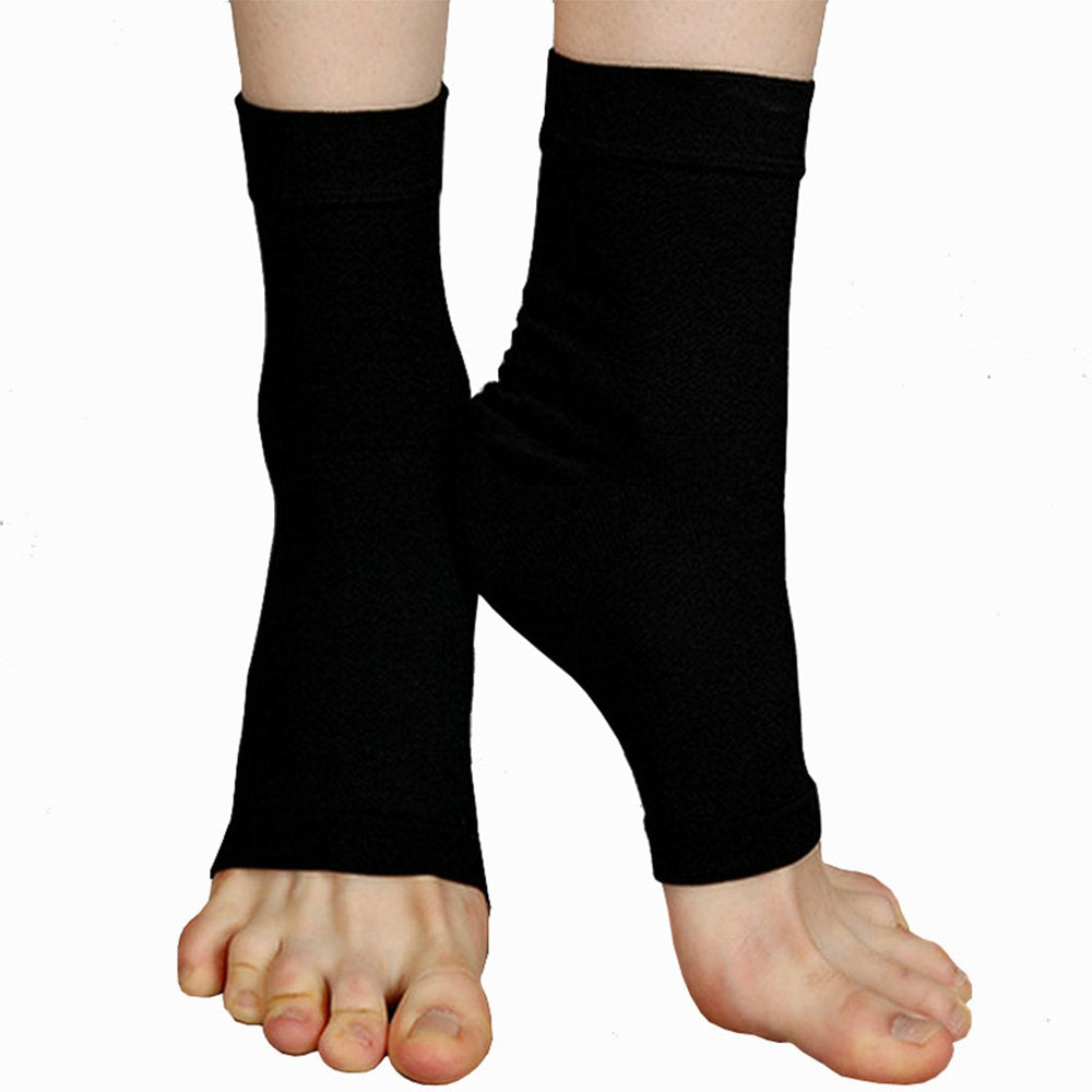 - Wear these ankle compression sleeves under your shoes and socks for pain relief in your heels caused by plantar fasciitis, injury, sprained ankle, Achilles tendonitis, edema, heel spurs, varicose veins, fallen arches, lymphedema, swollen ankles.