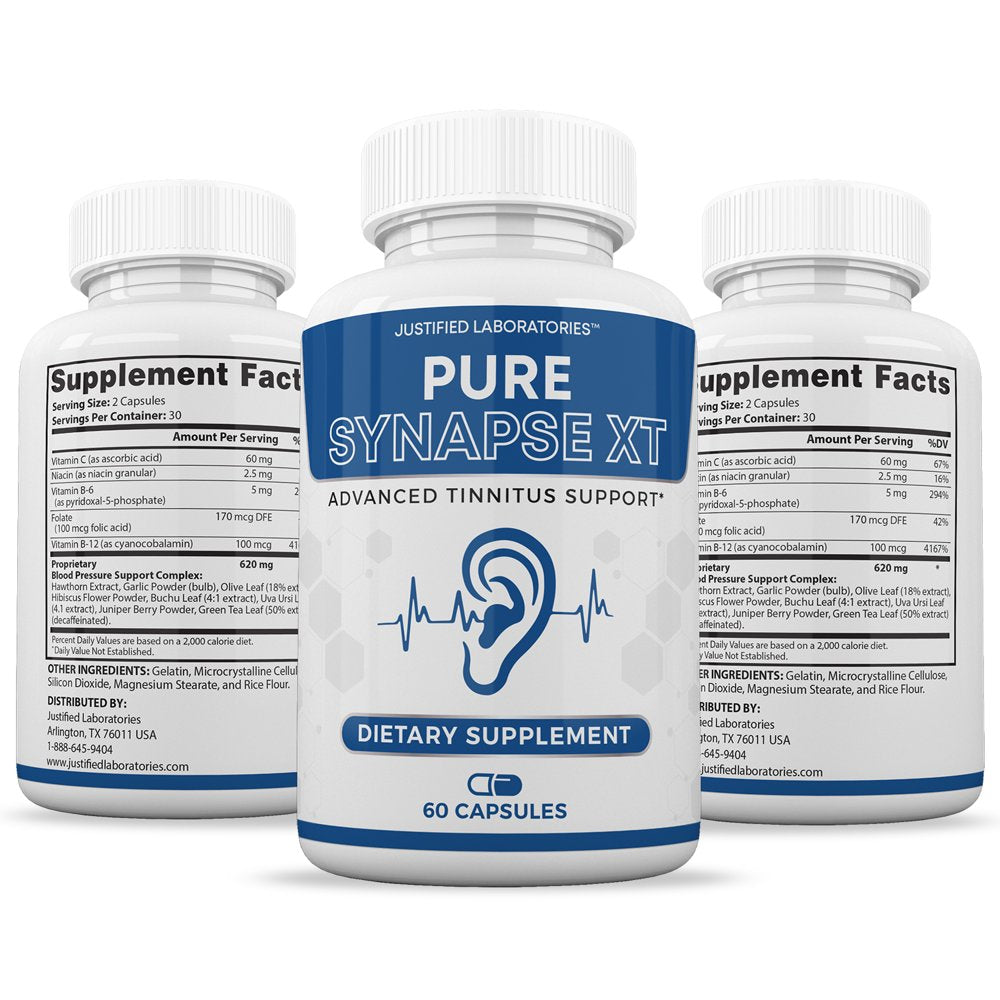 Justified Laboratories Pure Synapse XT is your next solution to support optimal hearing health! Our proprietary formula contains a power blend of 620MG natural ingredients and powerful antioxidants that may reduce ear ringing and other blood pressure issues. Pure Synapse XT not only improves tinnitus, but can enhance brain health such as, memory, sleep patterns and can eliminate the constant ringing sound associated with many internal ear and blood pressure issues.