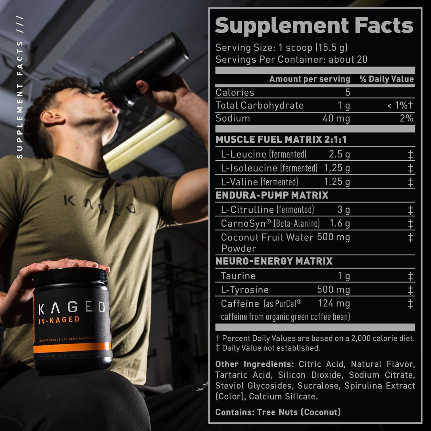 - CLEAN & PROVEN INGREDIENTS: At Kaged, we never hide behind proprietary blends. We don’t use inflated studies or borrowed science in an attempt to try to uphold cheap, generic ingredients. Our intra workout for men and women contains scientifically tested ingredients including a full spectrum of fermented BCAAs ( L-Leucine, L-Isoleucine, L-Valine) L-Citruline, coconut water powder, and CarnoSyn for next-level pumps, and a mix of taurine, L-Tyrosine, and PurCaf caffeine to keep you focused.