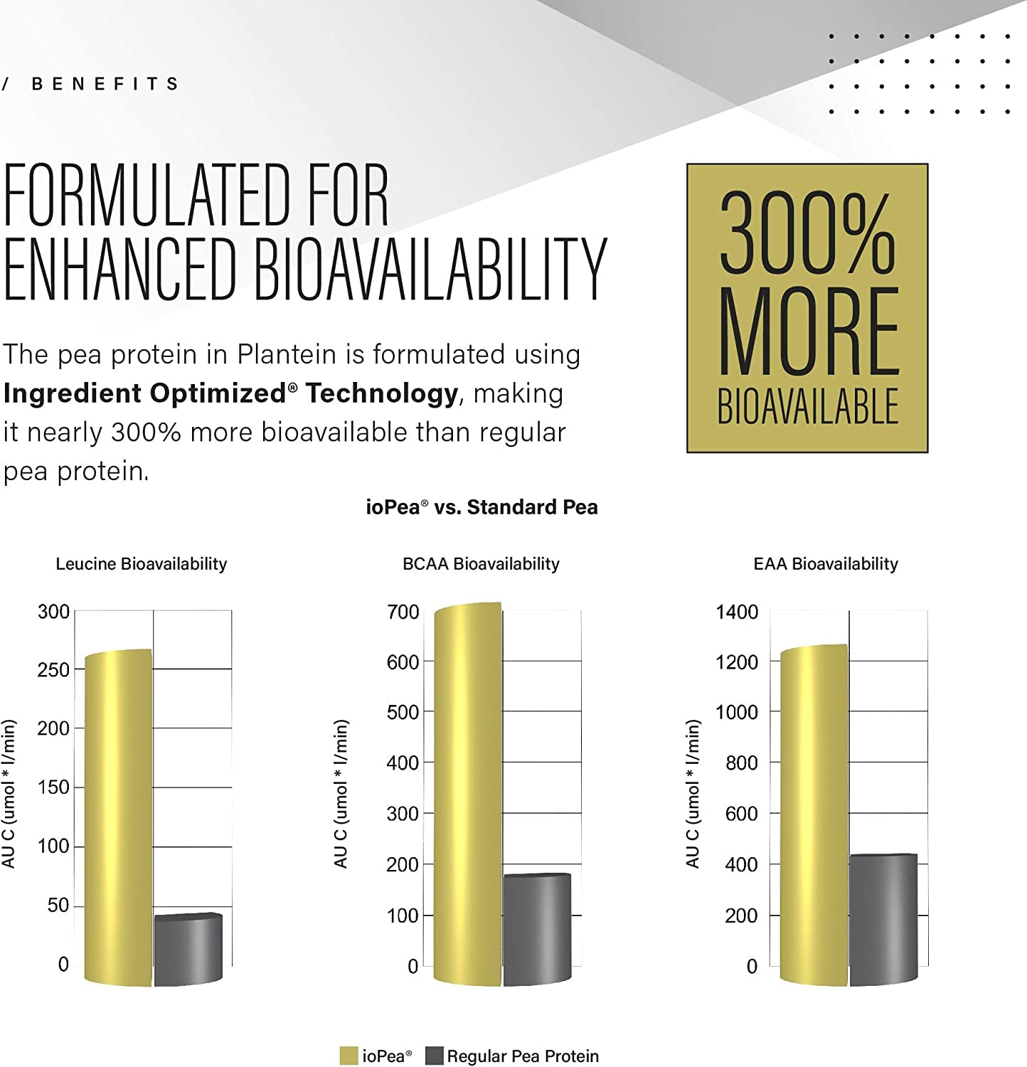 - VEGAN PROTEIN POWDER WITH 3X ENHANCED BIOAVAILABILITY: Easy on the stomach, the pea protein in Plantein is utilizes Ingredient Optimized Technology, which makes our pea protein isolate nearly 300% more bioavailable than regular pea protein.