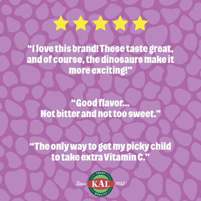 Like all KAL products, Vitamin C-Rex vitamin C chews are lab verified for purity, potency and identity. Confidence in the KAL name is just one of the reasons we’ve been around so long and maintain our place as a leader in the industry. Unlike many other companies, we manufacture almost all our own products, which gives us the ability to thoroughly test and screen raw ingredients for the slightest amount of impurities and manage the production process to provide the best possible quality. Rest assured, only the purest formulas ever reach your cabinet.