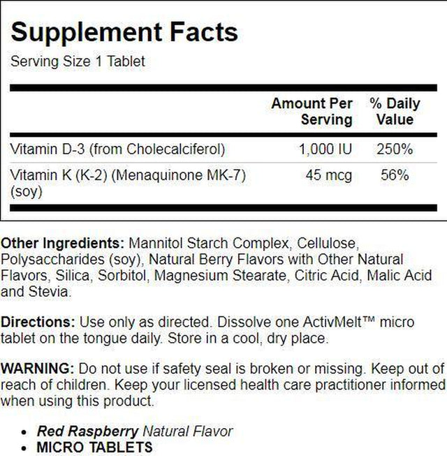 KAL D-3 and K-2 Activmelt | Healthy Bones, Heart & Immune Function Support | Instant Dissolve Tabs | Natural Red Raspberry Flavor | 60 Micro Tablets