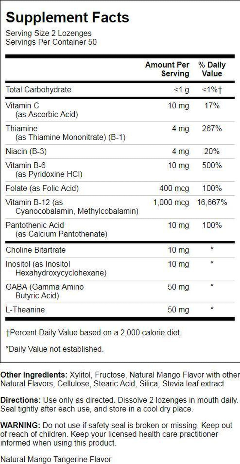 Formulated to help provide support for occasional stress, KAL GABA L-Theanine Stress B Lozenges may also help support healthy relaxation, focus, and a sense of wellbeing. With GABA (gamma aminobutyric acid), L-theanine (an amino acid), B-Complex vitamins, and a tasty natural mango tangerine flavor, our formula is as powerful as it is delicious! Vitamin C, folic acid, pantothenic acid, choline, and inositol are also included for added support.