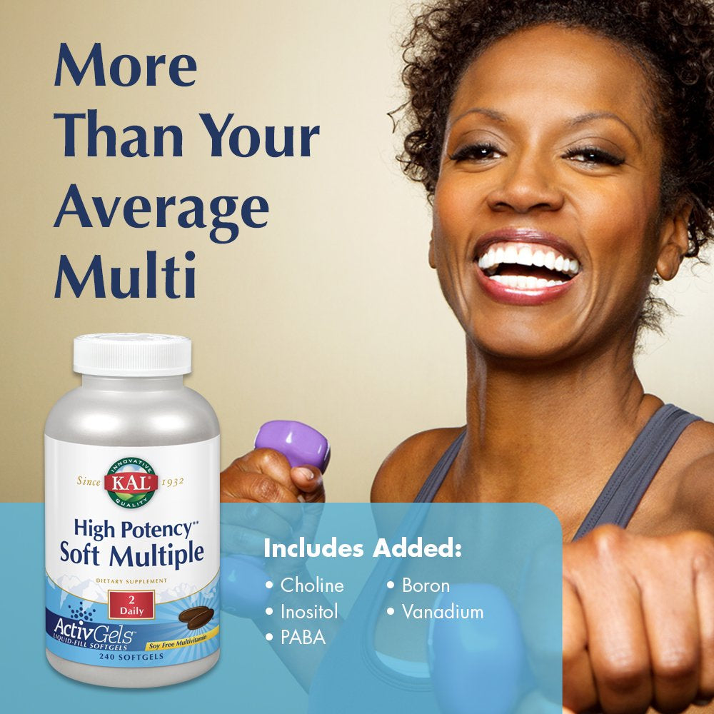 A brand name you’ve come to trust, KAL is pleased to offer a high-potency multi vitamin and mineral for men and women in our ActivGels soft gel form. With everything you need and nothing you don’t, our High Potency Soft Multiple ActivGels provide significant amounts of straightforward nutrients in a Rice Bran Oil base and are soy free.
