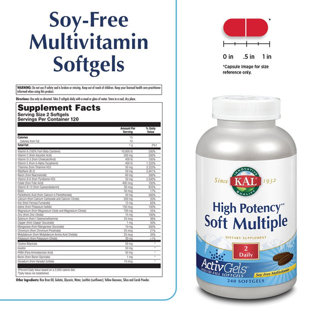 KAL High Potency Soft Multiple Activgels | Men & Women Multivitamin | Rice Bran Oil Base (120 Serv, 240 CT) - 120 Serv, 240 Ct is backordered and will ship as soon as it is back in stock.